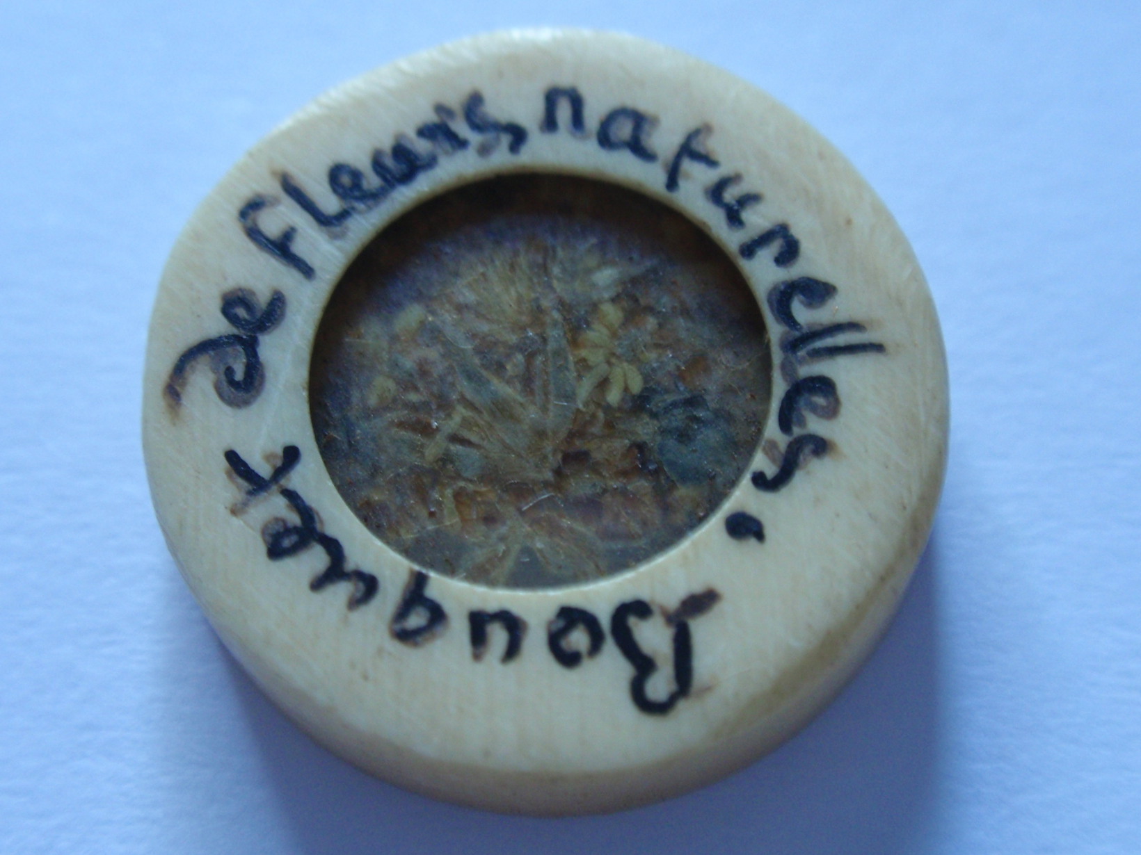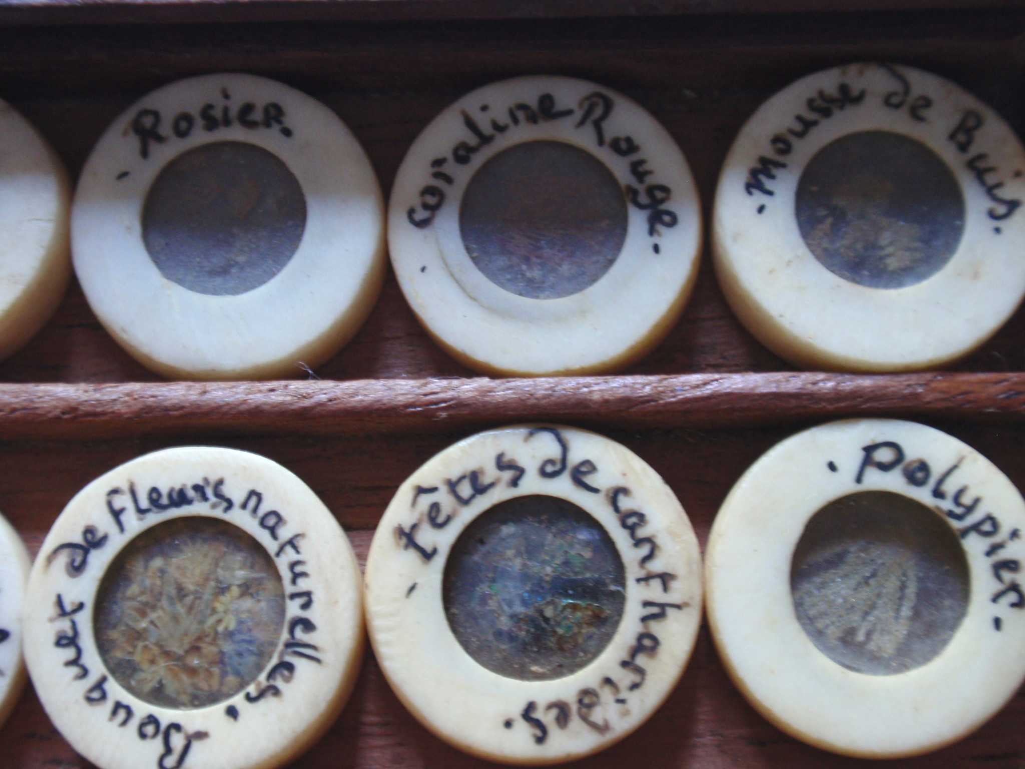 Boxed set of Ypelaar-Type specimens, labeled in Frech, ca. 1790, complete set of 20 circular ivory (bone) cells each 14,5 mm in outside diameter; set with botanic, zoologic, and mineral specimens, some colorful paarot neck feathers, samples from the iron mines of the island of Elba; fine condition (one glass is broken), all specimens are labeled, original mahogany case hand labeled "objets opaques, etc.".