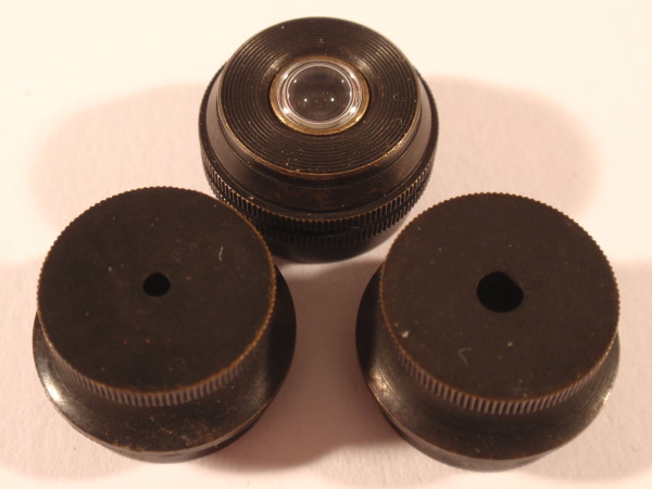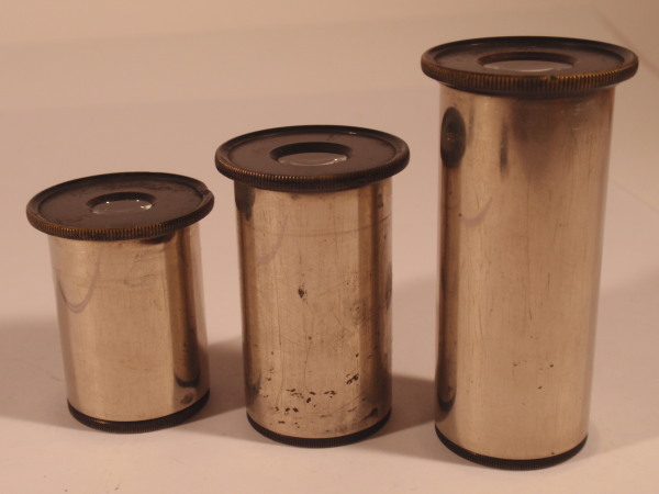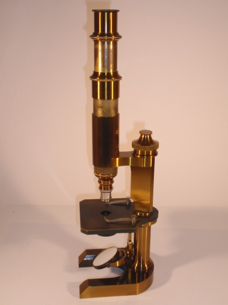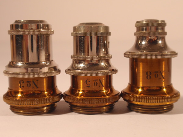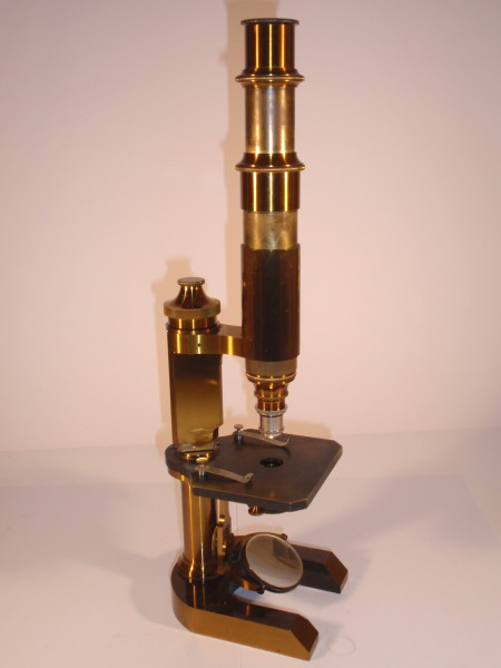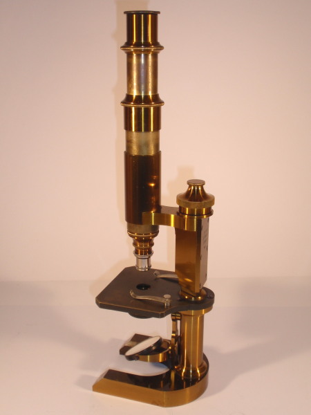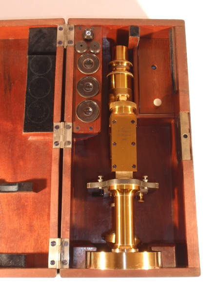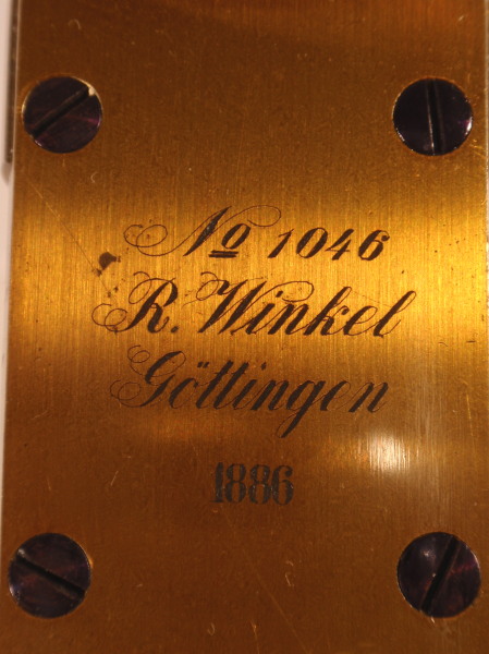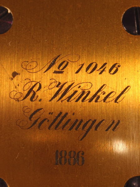voll Messing, original zaponiert, datiert 1886, Höhe 33 cm, 3 Okulare (Nr. 1, 3 und 5), 3 signierte und nummerierte Objektive (Nr. 3, 5 und 8, Bestzustand!), Grobeinstellung durch Verschieben des Tubus, Feineinstellung, Kondensoreinsatz in Schwalbenschwanzführung unter dem Tisch, 3 Lochblenden (eine davon mit eingebauter Kondensorlinse), per Hand verstellbarer Spiegel, schöne Signatur auf der Säule "No. 1.046 R. Winkel Göttingen 1886"; mechanisch und optisch sehr gut, Erhaltung sehr gut (offenbar wenig benutzt), der Fuß original punziert, sehr schöner Kasten.