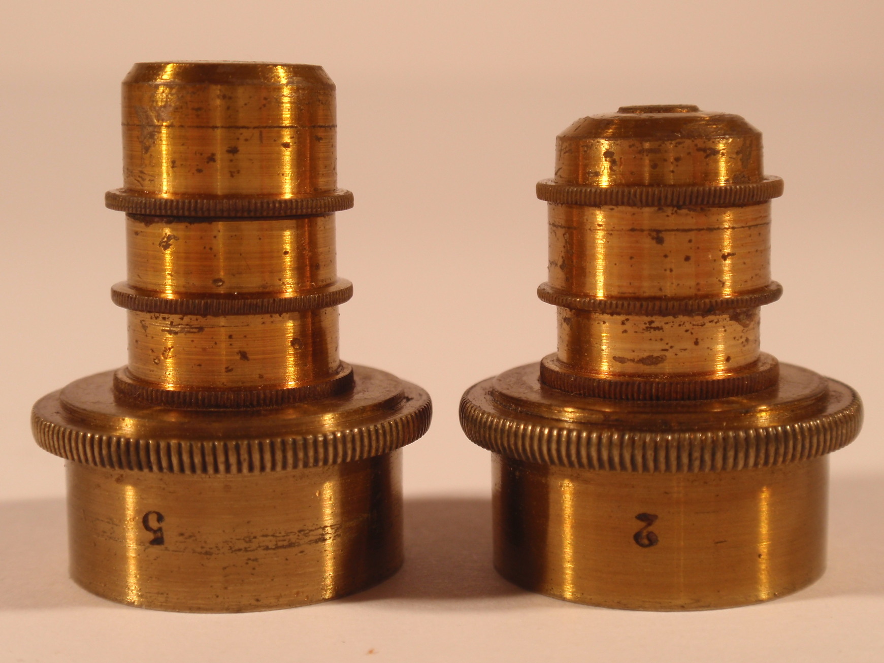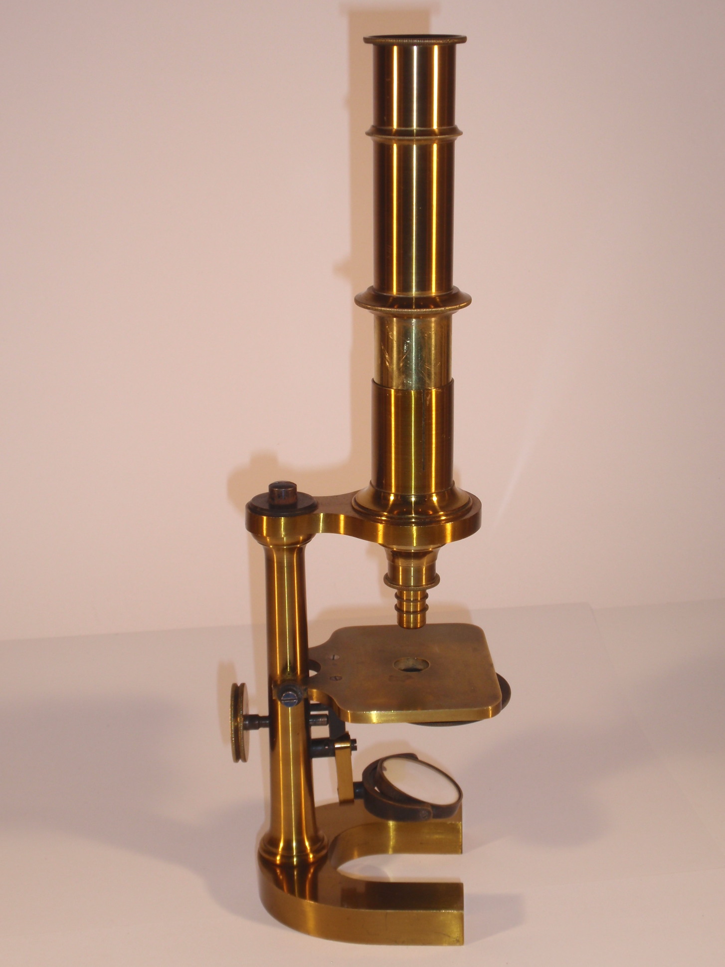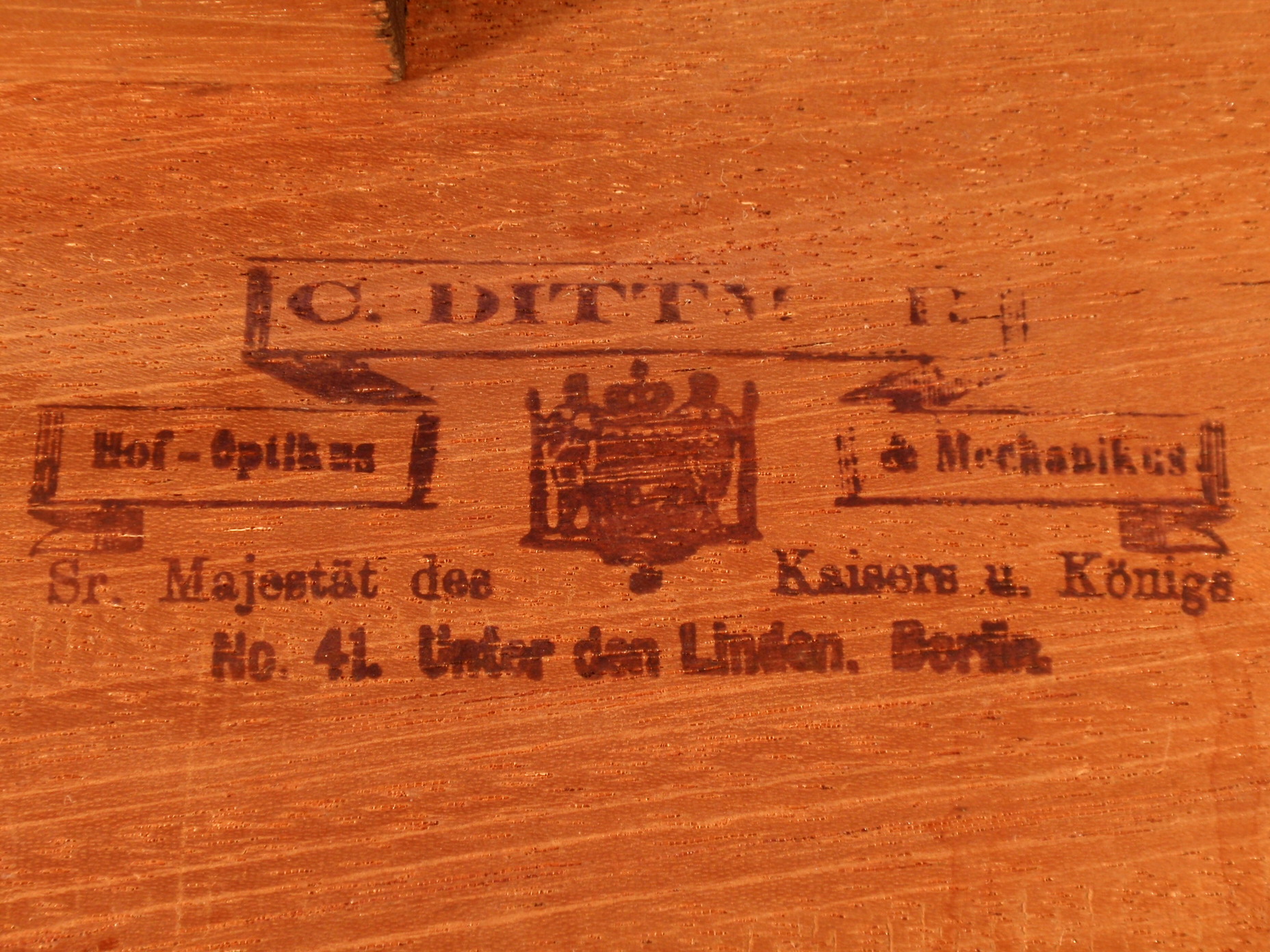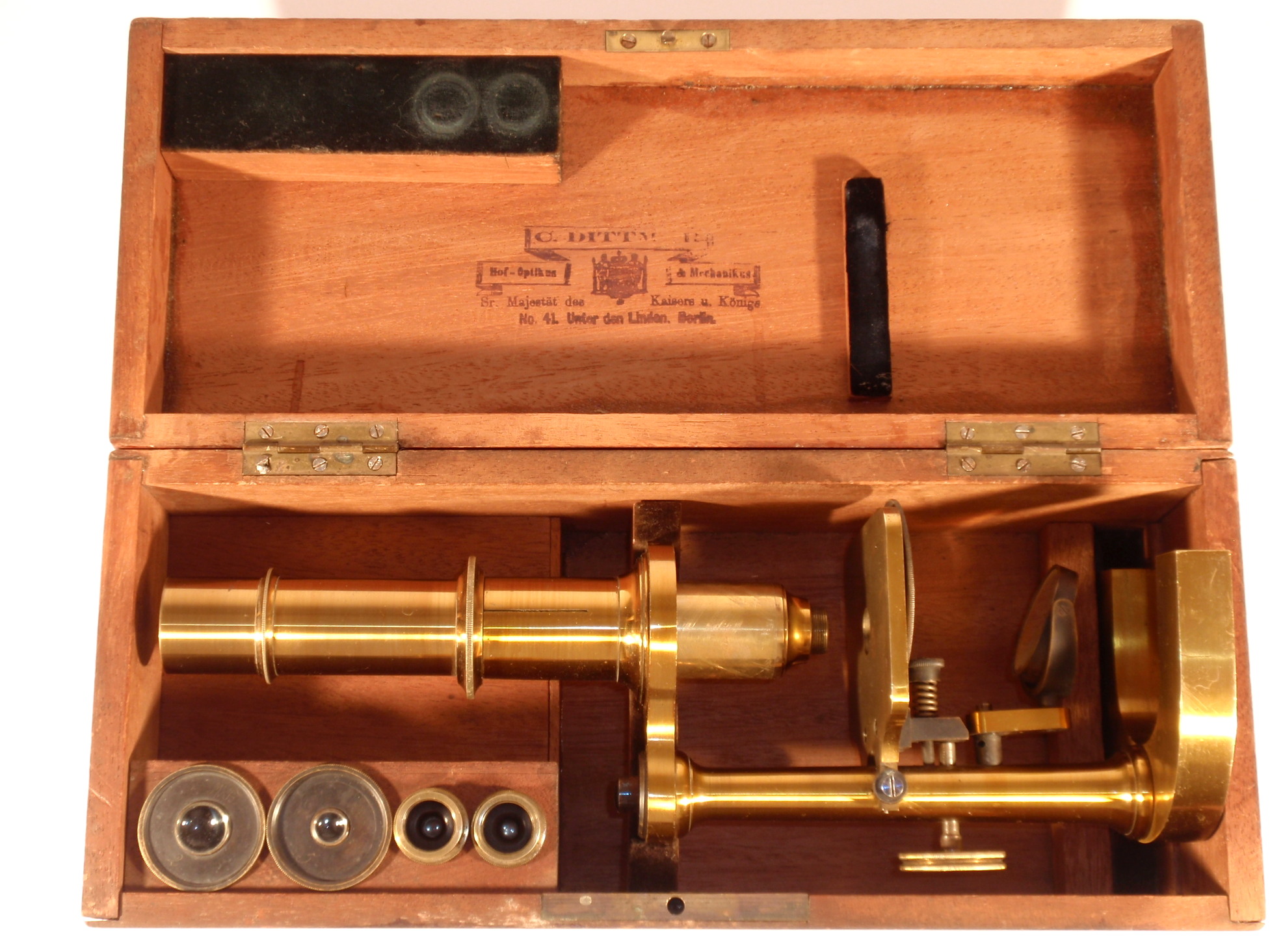 voll Messing, original zaponiert, ca. 1860 - 1880. Höhe 29 cm, 2 Okulare, 2 Objektive (Nr. 2 und 5); Grobeinstellung durch Verschieben des Tubus, Feineinstellung durch asymmetrisches Kippen des Tisches per Rändelschraube hinter dem Tisch; drehbare Lochblendenscheibe unter dem Tisch, im Kasten ein Stempel "C. Dittmeier Hof-Optiker & Mechaniker Sr. Majestät des Kaisers u. Königs No. 41. Unter den Linden. Berlin."; mechanisch und optisch gut, Erhaltung gut, Kasten mit Schlüssel. - C. Dittmeier war offenbar überwiegend Optiker und hat vermutlich keine oder kaum Mikroskope hergestellt, sondern nur mit ihnen gehandelt. Dieses Exemplar stammt vermutlich aus einer anderen Berliner Werkstatt.