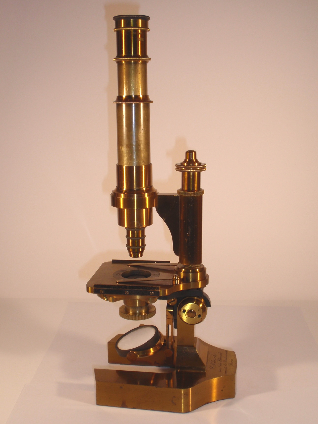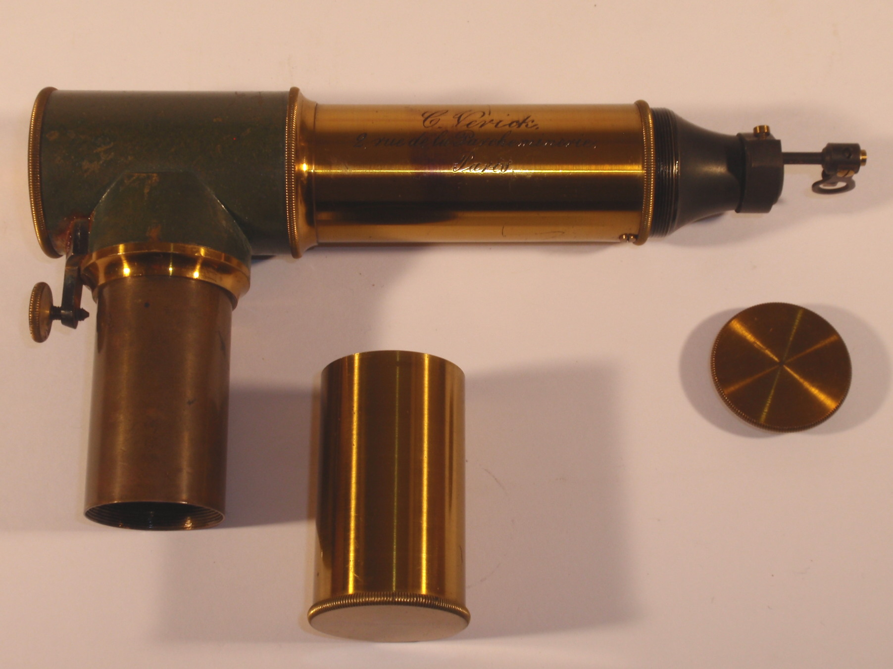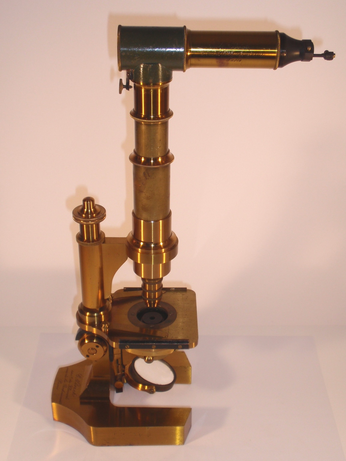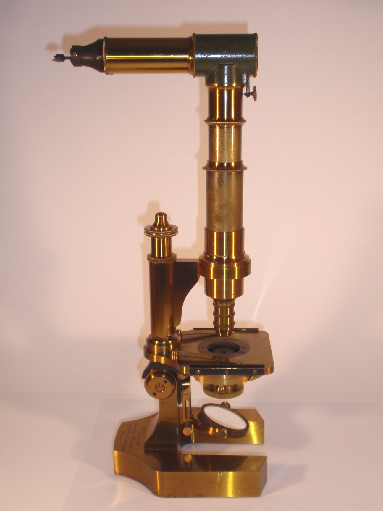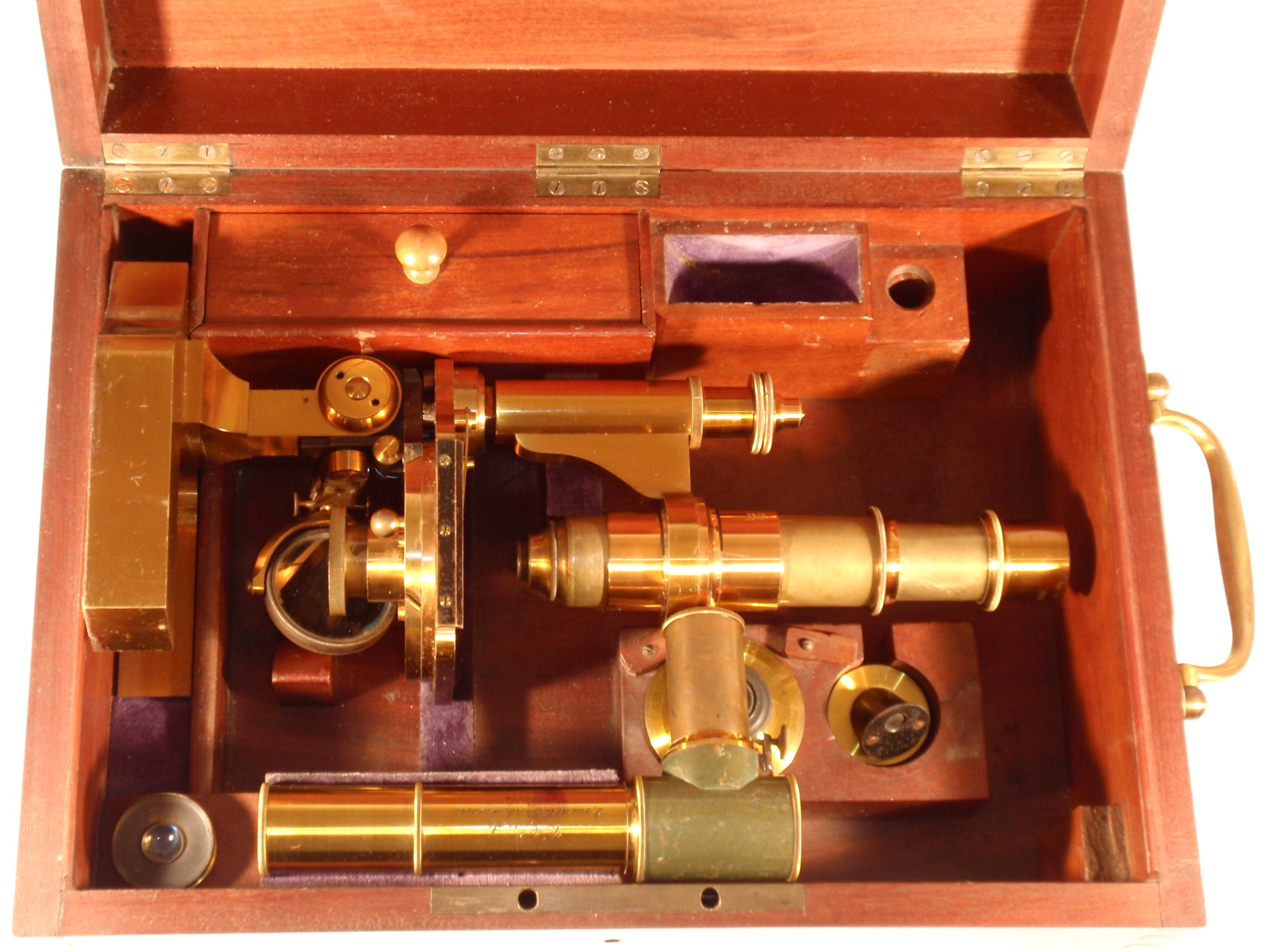 voll Messing, original zaponiert, ca. 1869 - 1873. Höhe 36 cm, 2 Okulare (Nr. 2 und Goniometerokular), 3 Objektive (Nr. 3, 6 und 7), 1 Projektionsprisma; Grobeinstellung per Tubus, Feineinstellung; Kondensorhülse in Schwalbenschwanzführung unter dem Tisch, abfahrbarer Spiegel, Objektmikrometer, Kippstativ; das Mikroskop ist um die optische Achse drehbar; zusätzlich ein Zeichenapparat nach Oberhäuser mit der Signatur "C. Verick, 2, rue de la Parcheminerie, Paris"; der Zeichenapparat ist komplett mit Prisma und 2 Schutzkappen; das Mikroskop trägt auf dem Fuß die Signatur "C. Verick sucr. de Kleinod rue de la Parcheminerie, 2 Paris"; mechanisch und optisch sehr gut, Erhaltung sehr gut; der schöne Kasten nimmt alles Zubehör komplett auf, mit Schlüssel. -