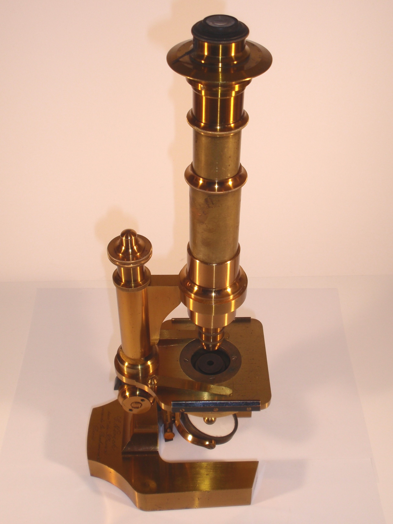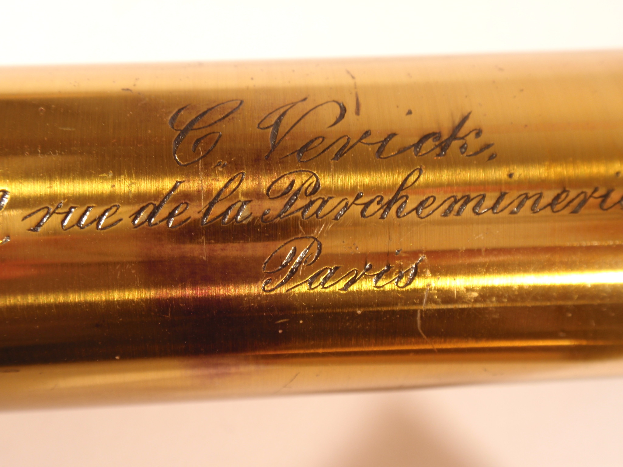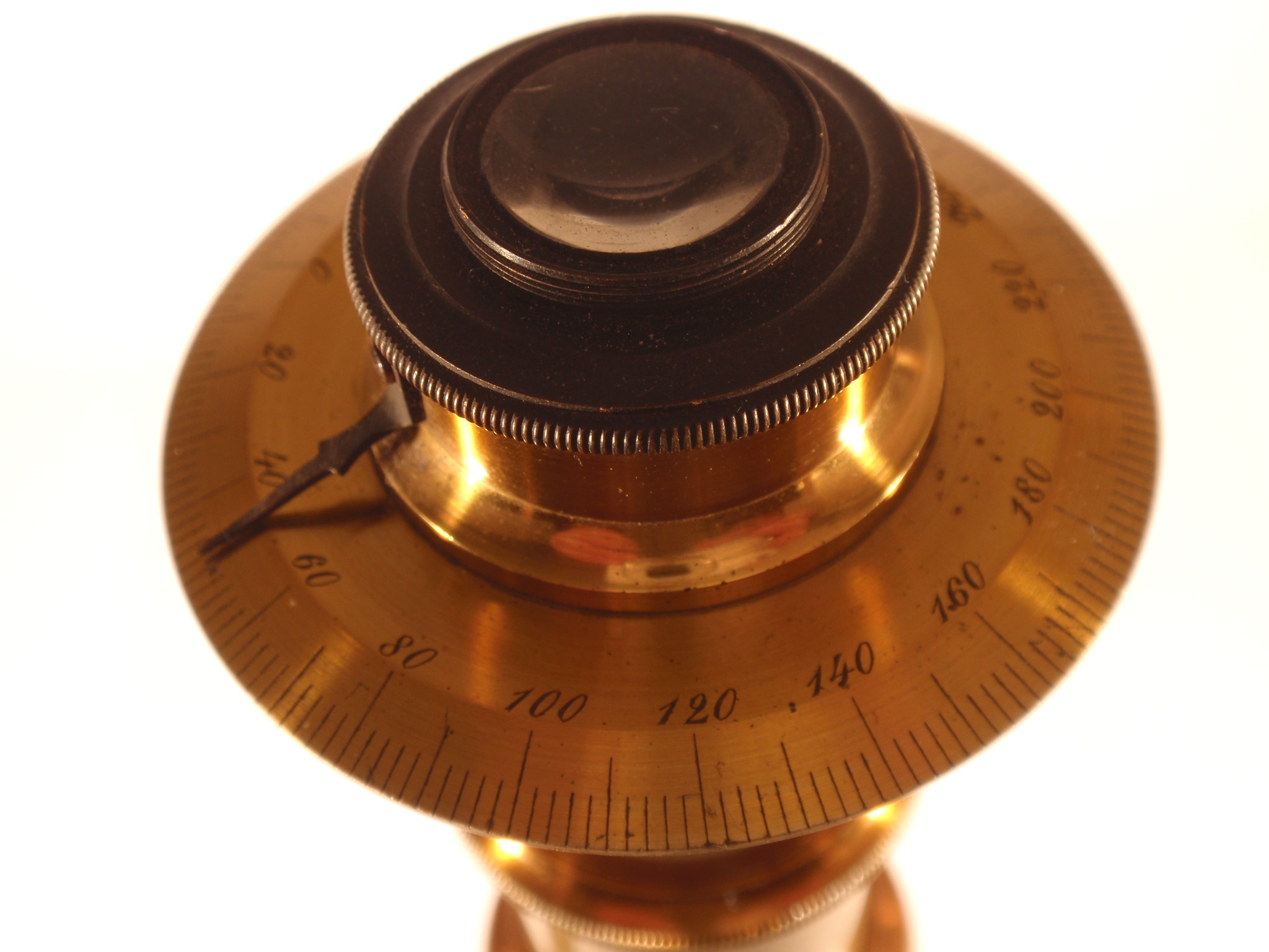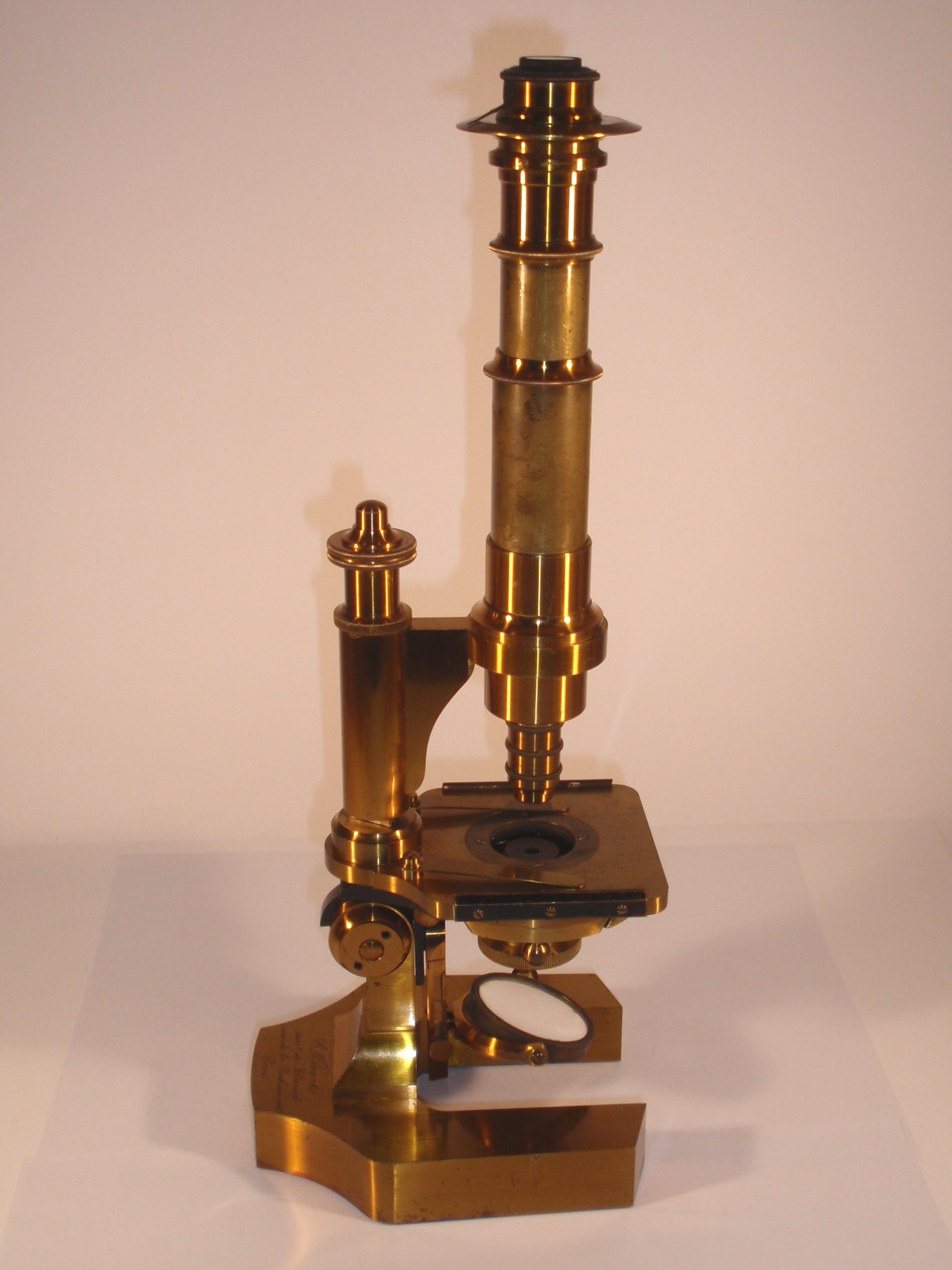 voll Messing, original zaponiert, ca. 1869 - 1873. Höhe 36 cm, 2 Okulare (Nr. 2 und Goniometerokular), 3 Objektive (Nr. 3, 6 und 7), 1 Projektionsprisma; Grobeinstellung per Tubus, Feineinstellung; Kondensorhülse in Schwalbenschwanzführung unter dem Tisch, abfahrbarer Spiegel, Objektmikrometer, Kippstativ; das Mikroskop ist um die optische Achse drehbar; zusätzlich ein Zeichenapparat nach Oberhäuser mit der Signatur "C. Verick, 2, rue de la Parcheminerie, Paris"; der Zeichenapparat ist komplett mit Prisma und 2 Schutzkappen; das Mikroskop trägt auf dem Fuß die Signatur "C. Verick sucr. de Kleinod rue de la Parcheminerie, 2 Paris"; mechanisch und optisch sehr gut, Erhaltung sehr gut; der schöne Kasten nimmt alles Zubehör komplett auf, mit Schlüssel. -