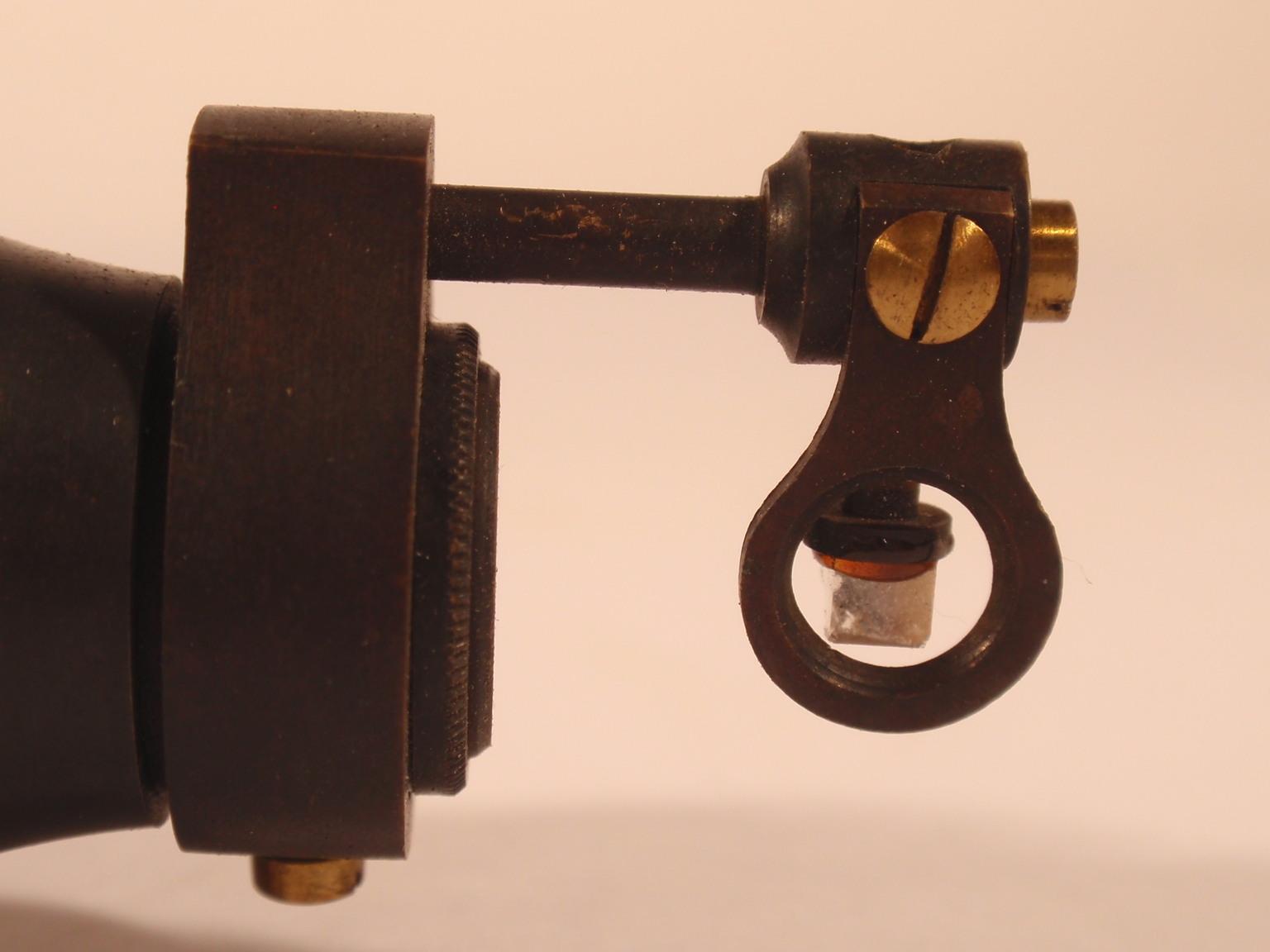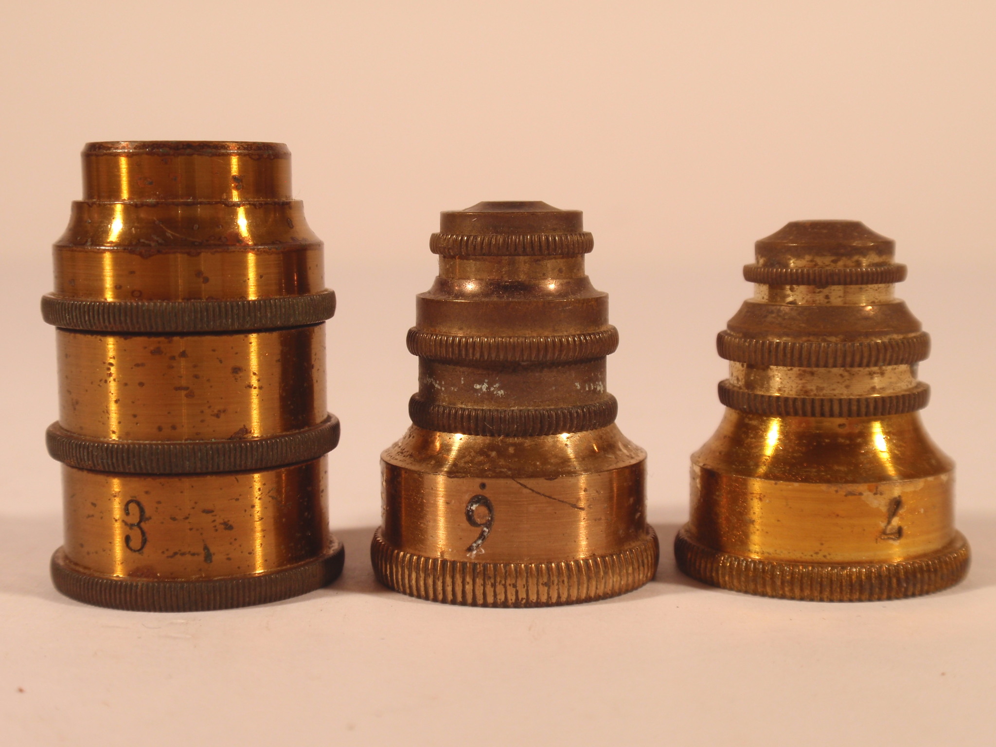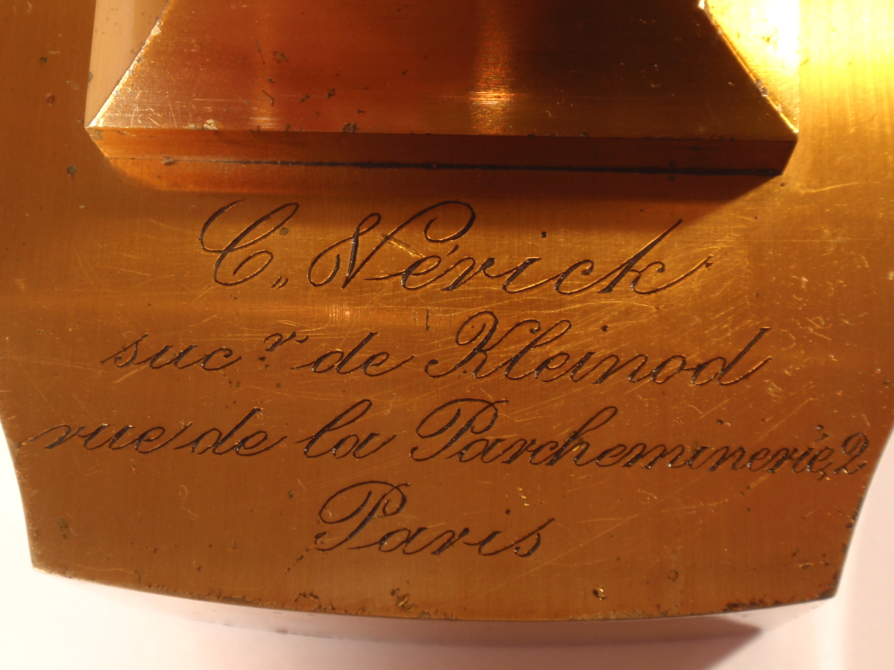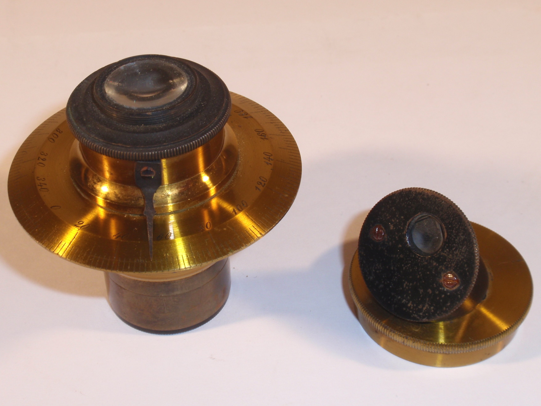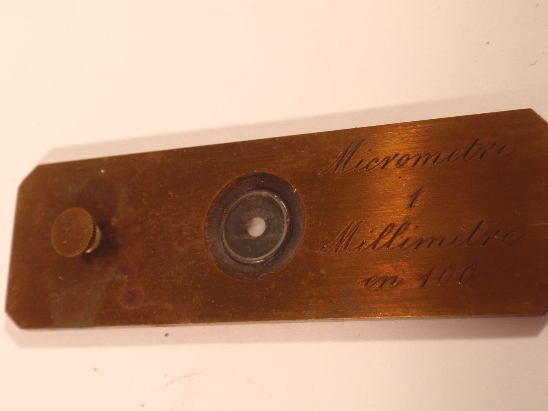 voll Messing, original zaponiert, ca. 1869 - 1873. Höhe 36 cm, 2 Okulare (Nr. 2 und Goniometerokular), 3 Objektive (Nr. 3, 6 und 7), 1 Projektionsprisma; Grobeinstellung per Tubus, Feineinstellung; Kondensorhülse in Schwalbenschwanzführung unter dem Tisch, abfahrbarer Spiegel, Objektmikrometer, Kippstativ; das Mikroskop ist um die optische Achse drehbar; zusätzlich ein Zeichenapparat nach Oberhäuser mit der Signatur "C. Verick, 2, rue de la Parcheminerie, Paris"; der Zeichenapparat ist komplett mit Prisma und 2 Schutzkappen; das Mikroskop trägt auf dem Fuß die Signatur "C. Verick sucr. de Kleinod rue de la Parcheminerie, 2 Paris"; mechanisch und optisch sehr gut, Erhaltung sehr gut; der schöne Kasten nimmt alles Zubehör komplett auf, mit Schlüssel. -
