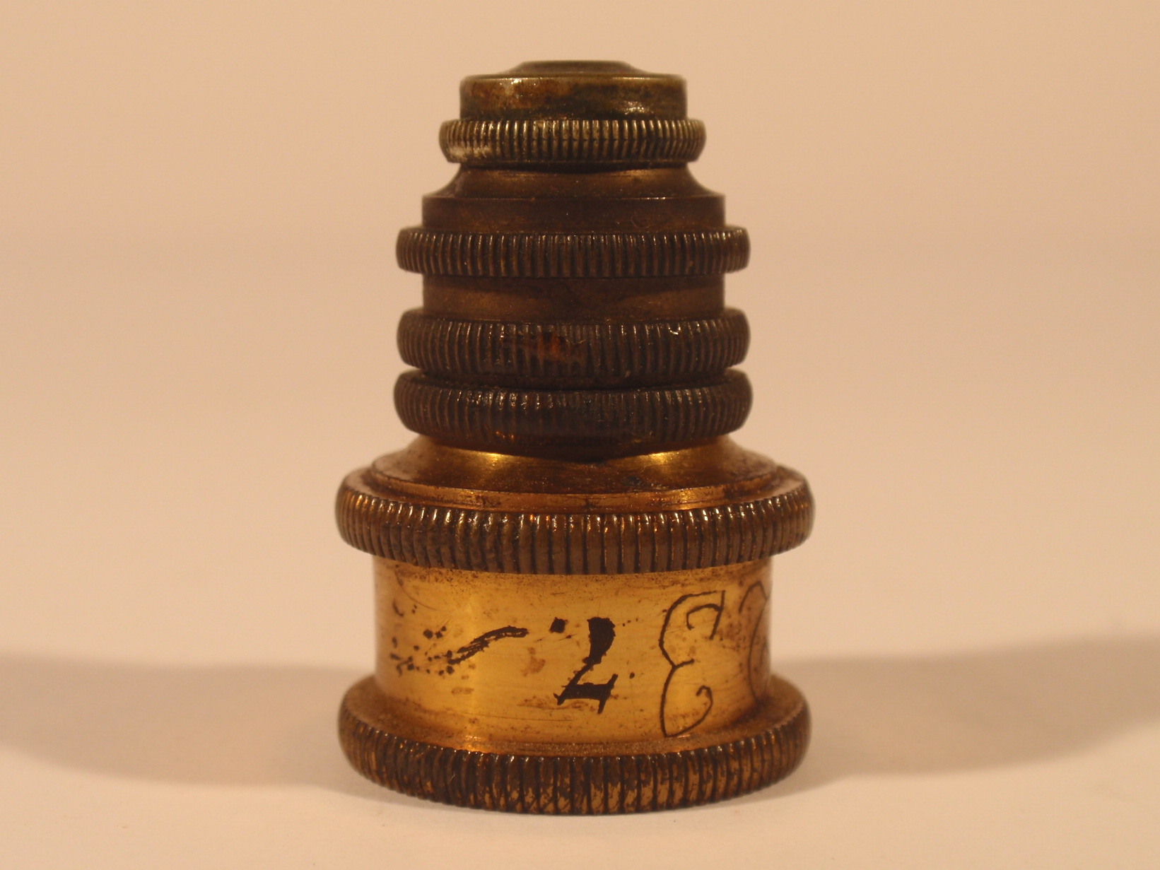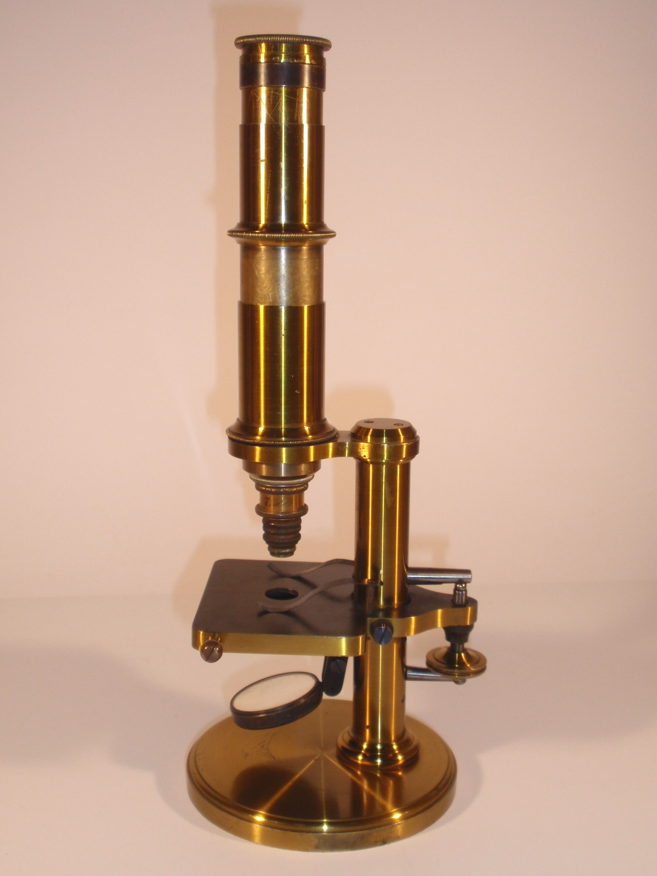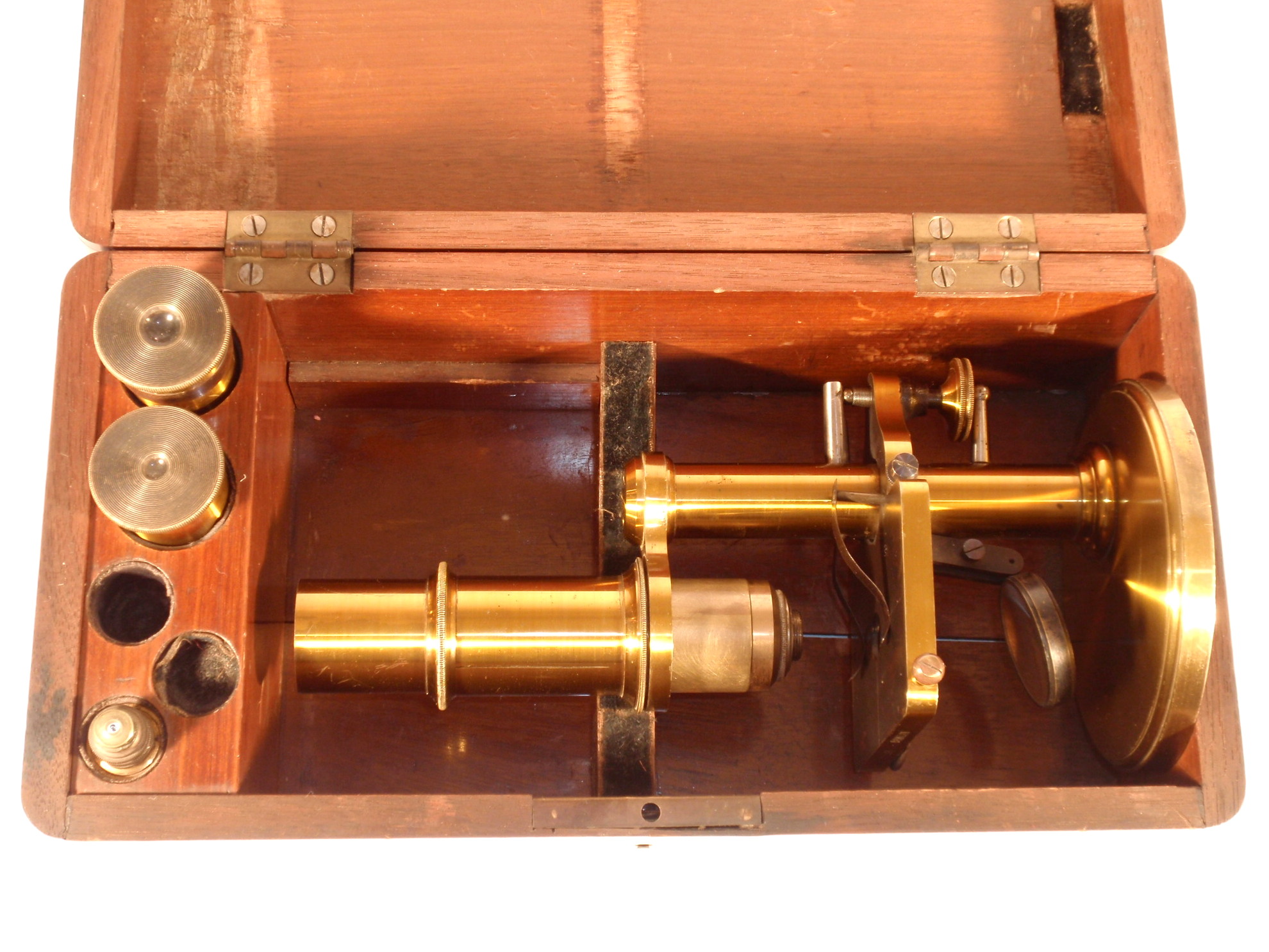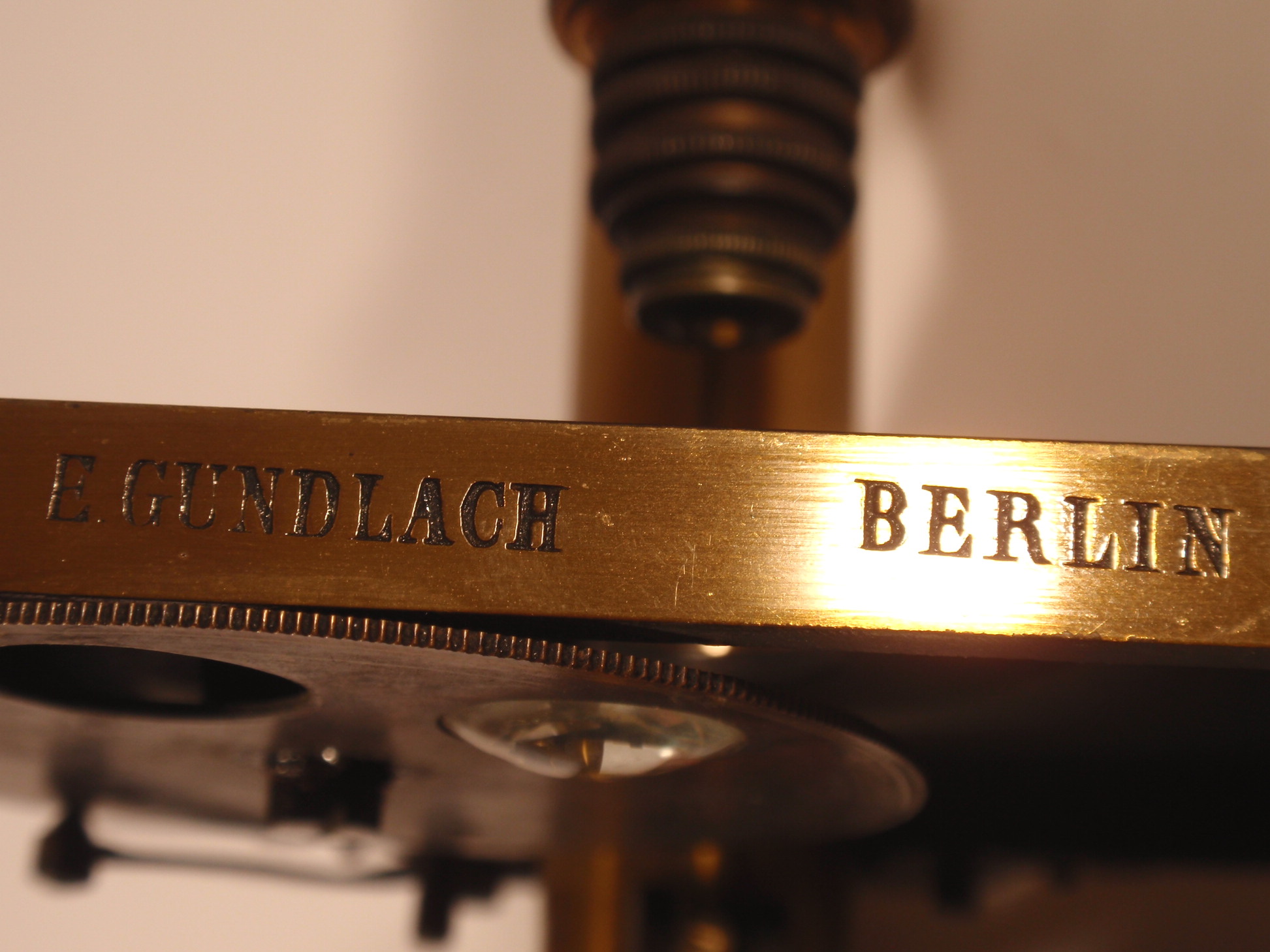 vollMessing, original zaponiert, ca. 1869 - 1871, Höhe 27 cm; 1 nummeriertes Objektiv ("7"), 2 Okulare (eines davon mit Mikrometereinschub), Grobeinstellung durch Verschieben des Tubus, Feineinstellung mit der Rändelschraube hinter der Stativsäule; dadurch wird der Tisch asymmetrisch gekippt; Lochblendenscheibe mit 6 Lochblenden unter dem Tisch; ungewöhnliche Lösung: eine Lochblende ist mit einer Kondensorlinse ausgestattet; Signatur auf der vorderen Tischkante "E. Gundlach Berlin"; mechanisch und optisch sehr gut, Erhaltung sehr gut (bestens erhaltene Zaponierung!); original Kasten ohne die sonst vorhandene eingestanzte Nummer. – Ein seltenes Mikroskop eines Herstellers, der nur wenige über 1.000 Mikroskope mit seiner Signatur fertigte!