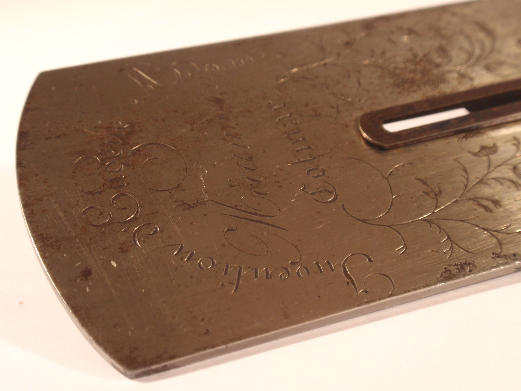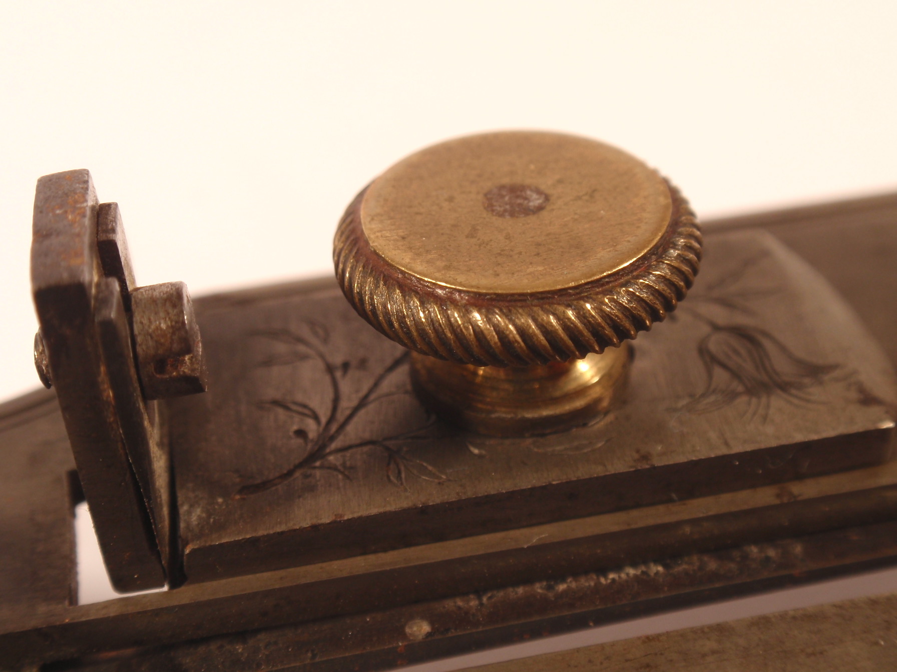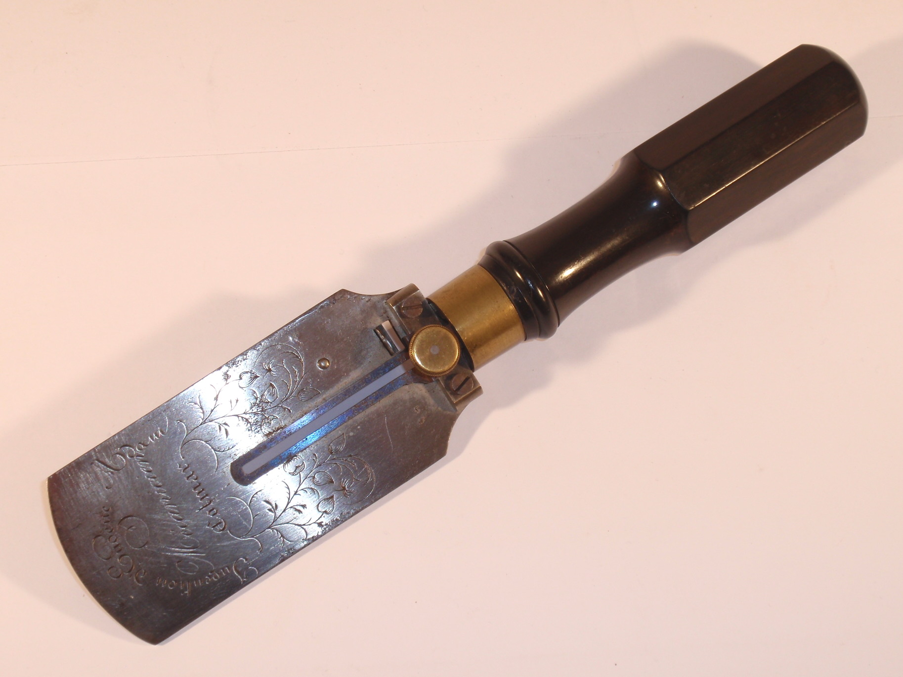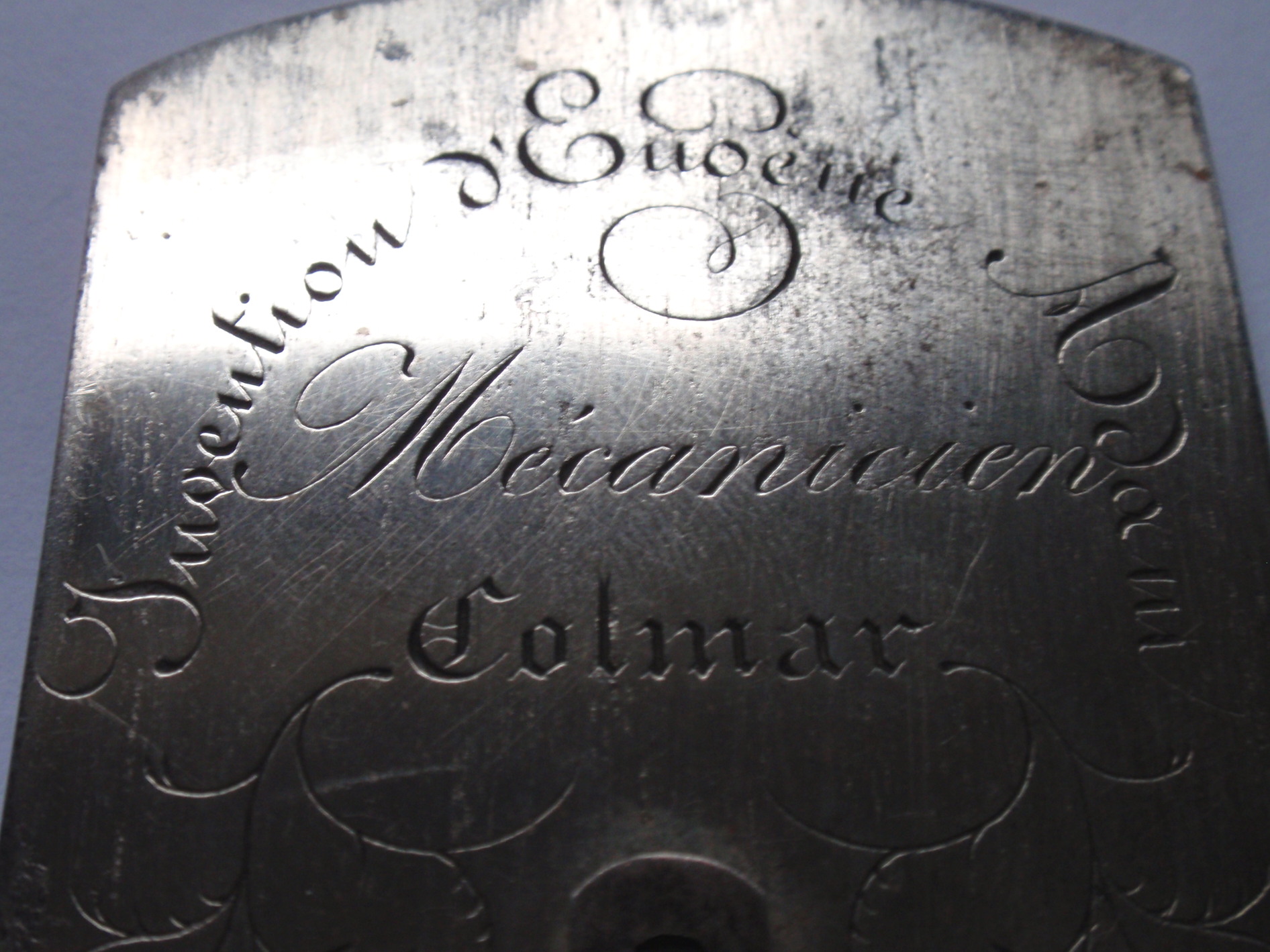 teilweise Messing, ansonsten Stahl mit Holzgriff, ca. 1778 - 1790, Länge 22 cm, Breite vorne 4,5 cm; in der Literatur nicht bekannte Signatur "Eugéne Adam Colmar Mechanicien"; künstlerisch verziert mit floralem Dekor; Adam hat ansonsten Rasierzeug, Scheren und Messer für das Friseurhandwerk hergestellt. Sehr guter Zustand.