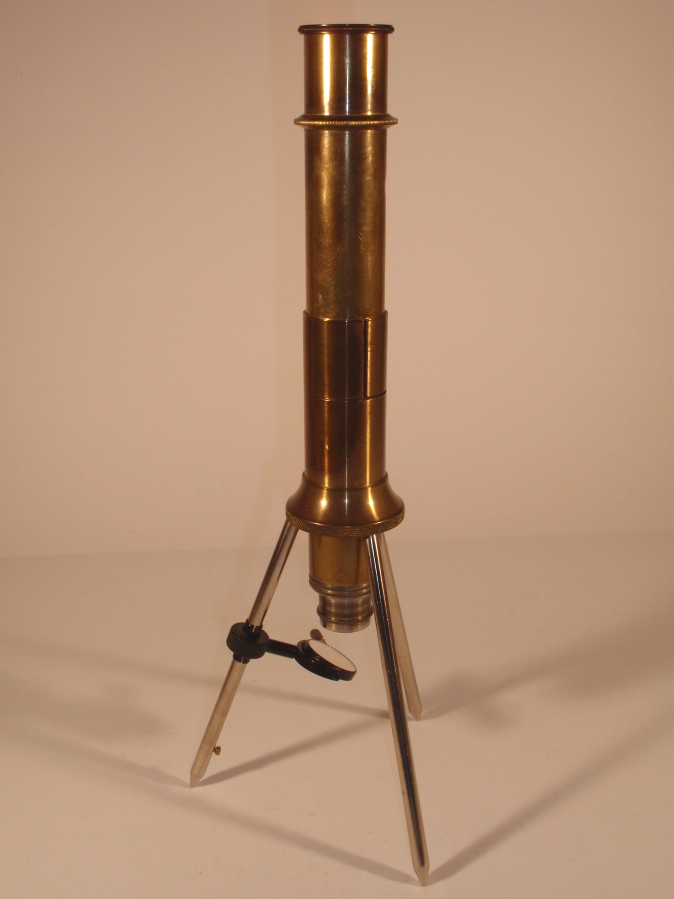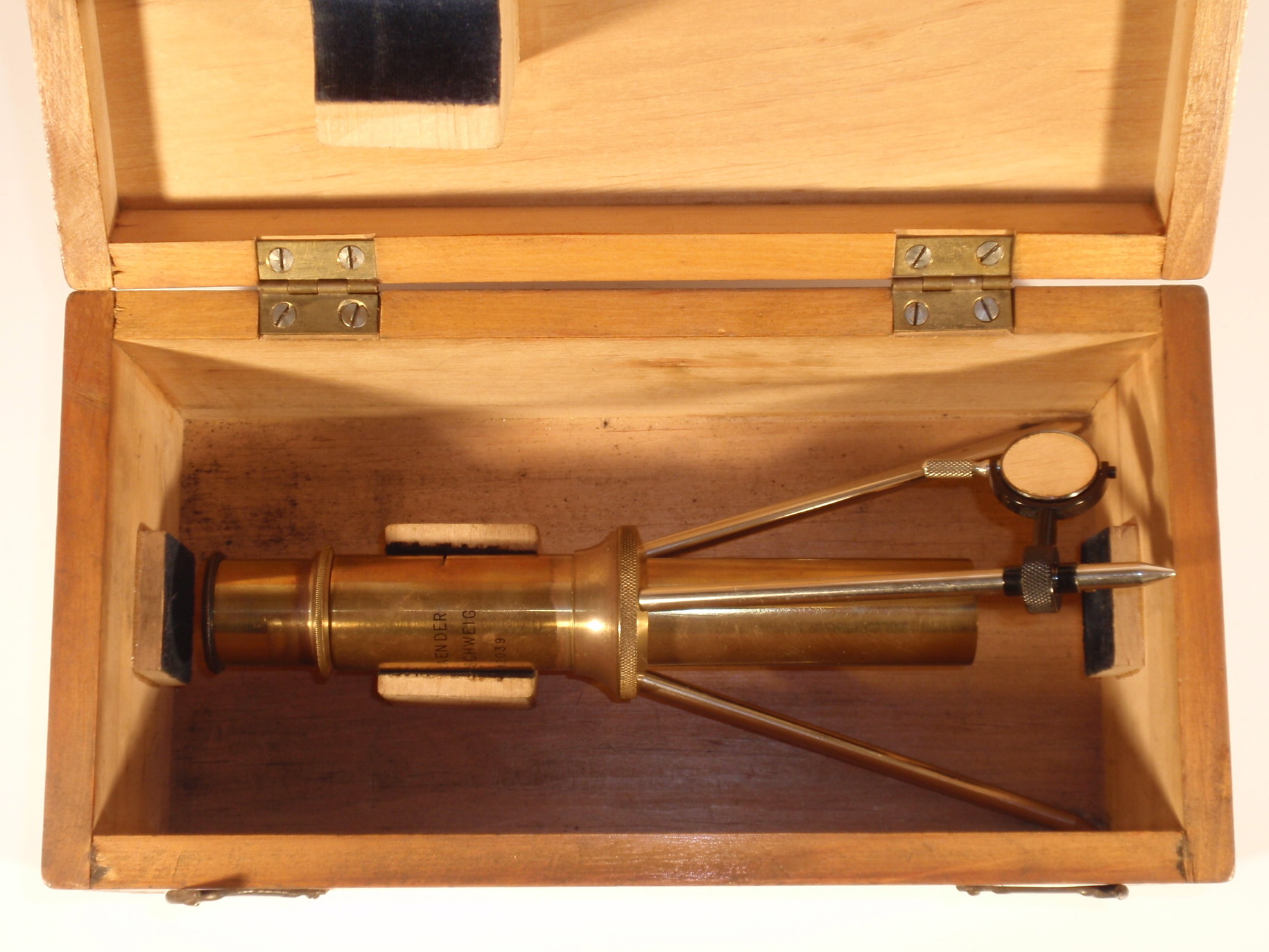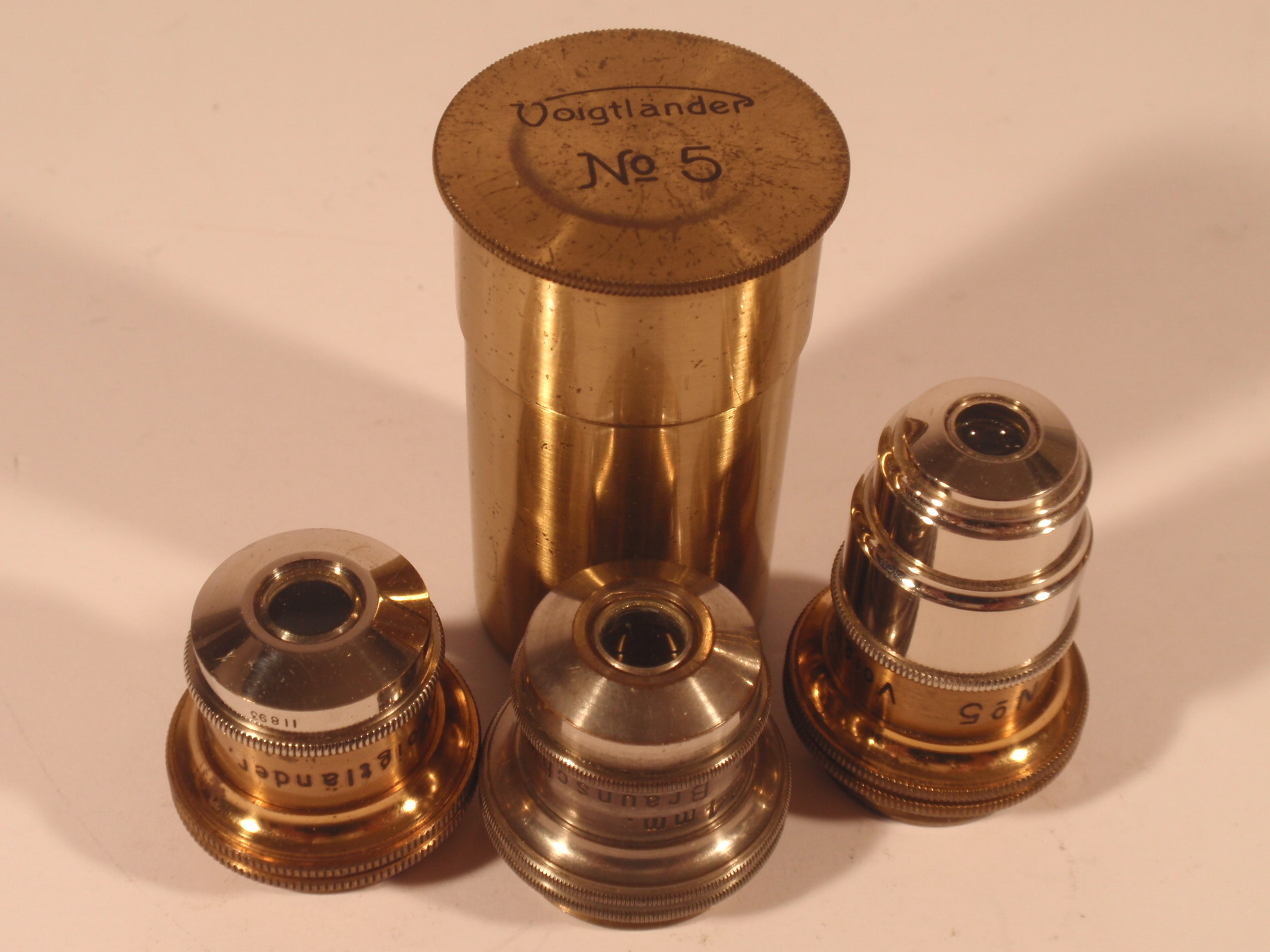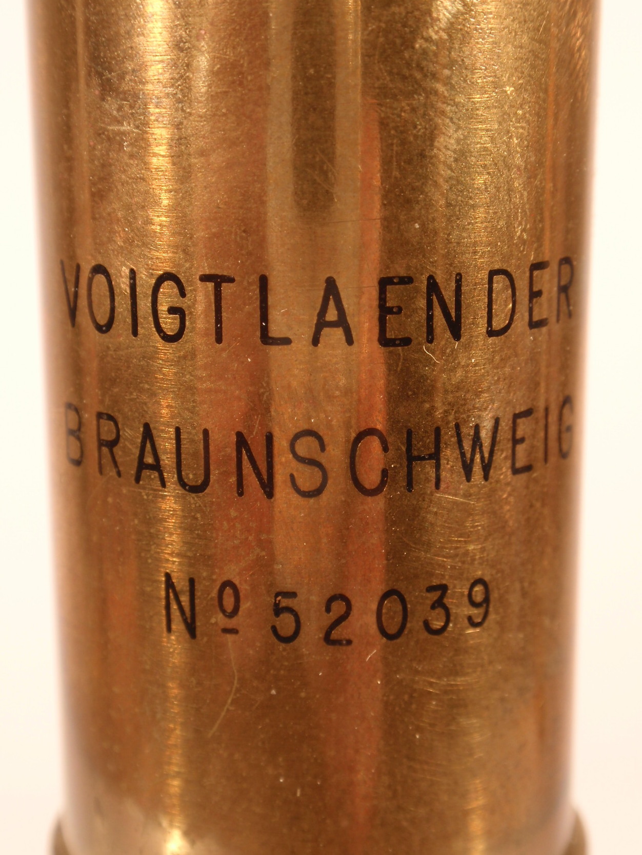 voll Messing, patiniert, ca. 1900 - 11915. Höhe 24 cm, 1 Okular (Nr. 4; signiert "V. & S. Br." d. h. Voigtlaender & Sohn in Braunschweig), 3 signierte Objektive (Nr. 2, 5 und 24 mm; die Nr. 5 in einer signierten Messingdose); Grob- und Feineinstellung per Tubus, Signatur auf dem Tubus "Voigtlaender Braunschweig No. 52.039"; mechanisch und optisch gut, Erhaltung befriedigend, Kasten.