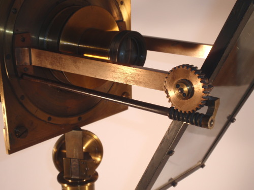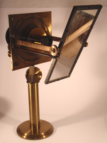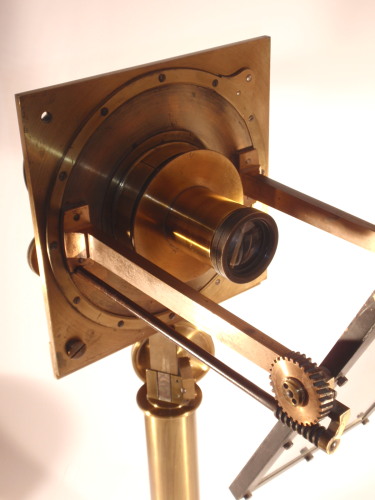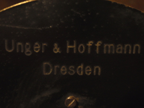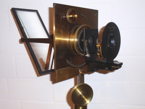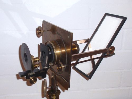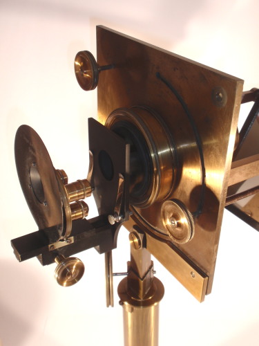 voll Messing, original zaponiert, ca. 1885 - 1900, Höhe über dem Stativ 52 cm, 1 Okular, 3 Objektive in einem 3fach-Revolver, Grob- und Feineinstellung durch einen Trieb; 3 weitere Triebe erzeugen mit Zahn und Trieb eine Spiegeldrehung (Größe des Spiegels 12 x 30 cm), eine Drehung des Mikroskops um die optische Achse und eine Höherverstellung über das Stativ; alles funktioniert bestens; Signatur auf der schwarzen Schiebe auf der Revolverrückseite "Unger & Hoffmann Dresden"; mechanisch und optisch gut bis sehr gut, Erhaltung sehr gut, kein Kasten. - Als Bestandteil der inzwischen mehr als 150 Jahre alten Dresdner Fotoindustrie stellte die Firma "Unger & Hoffmann" gegen Ende des 19. Jh. Projektionsapparate und Kameras (u. a. die "Verax") her. Dieses riesige und schwere Mikroskop dürfte mikroskopischen Demonstrationszwecken gedient haben (Gewicht 9,1 KG).
