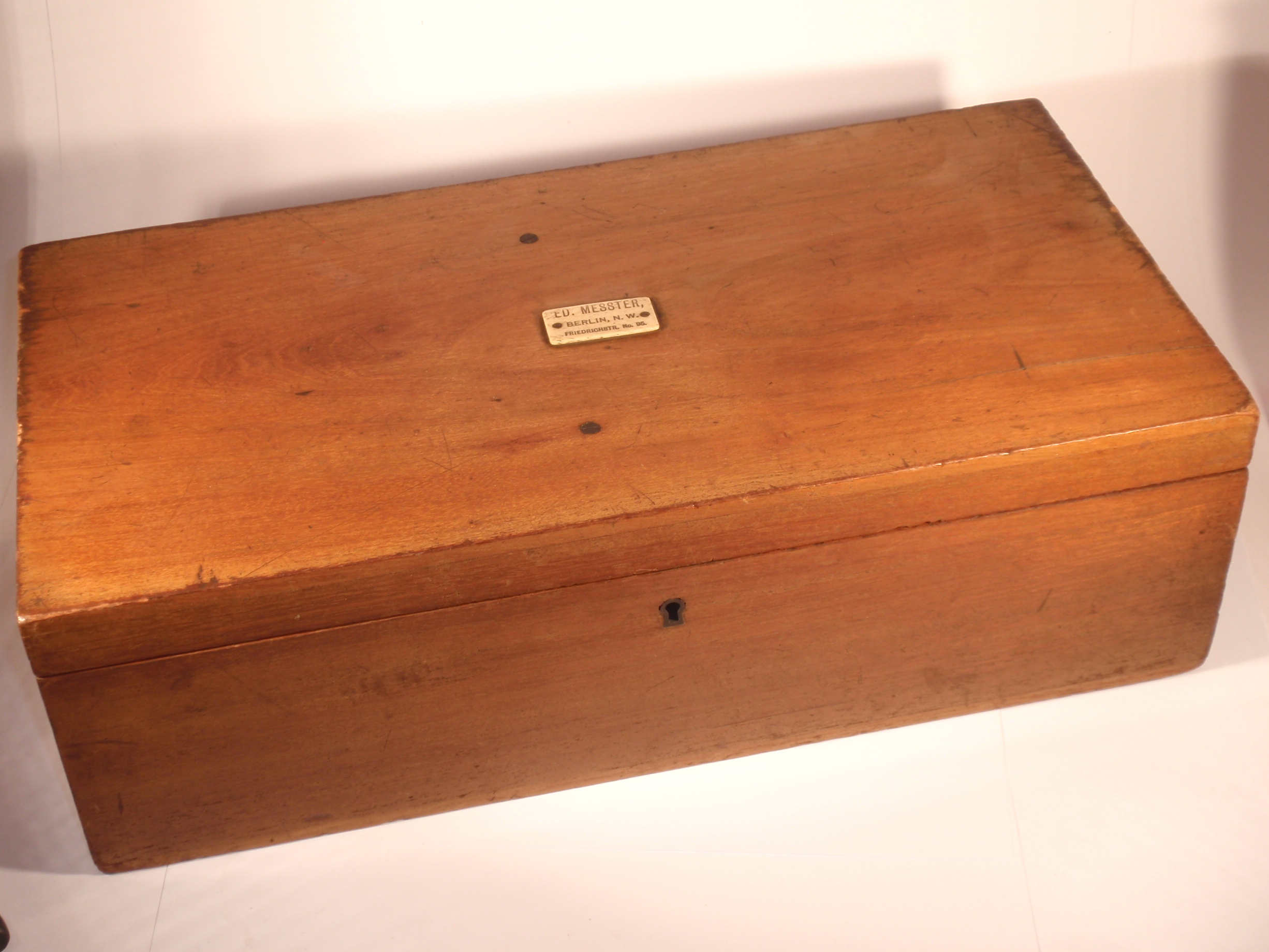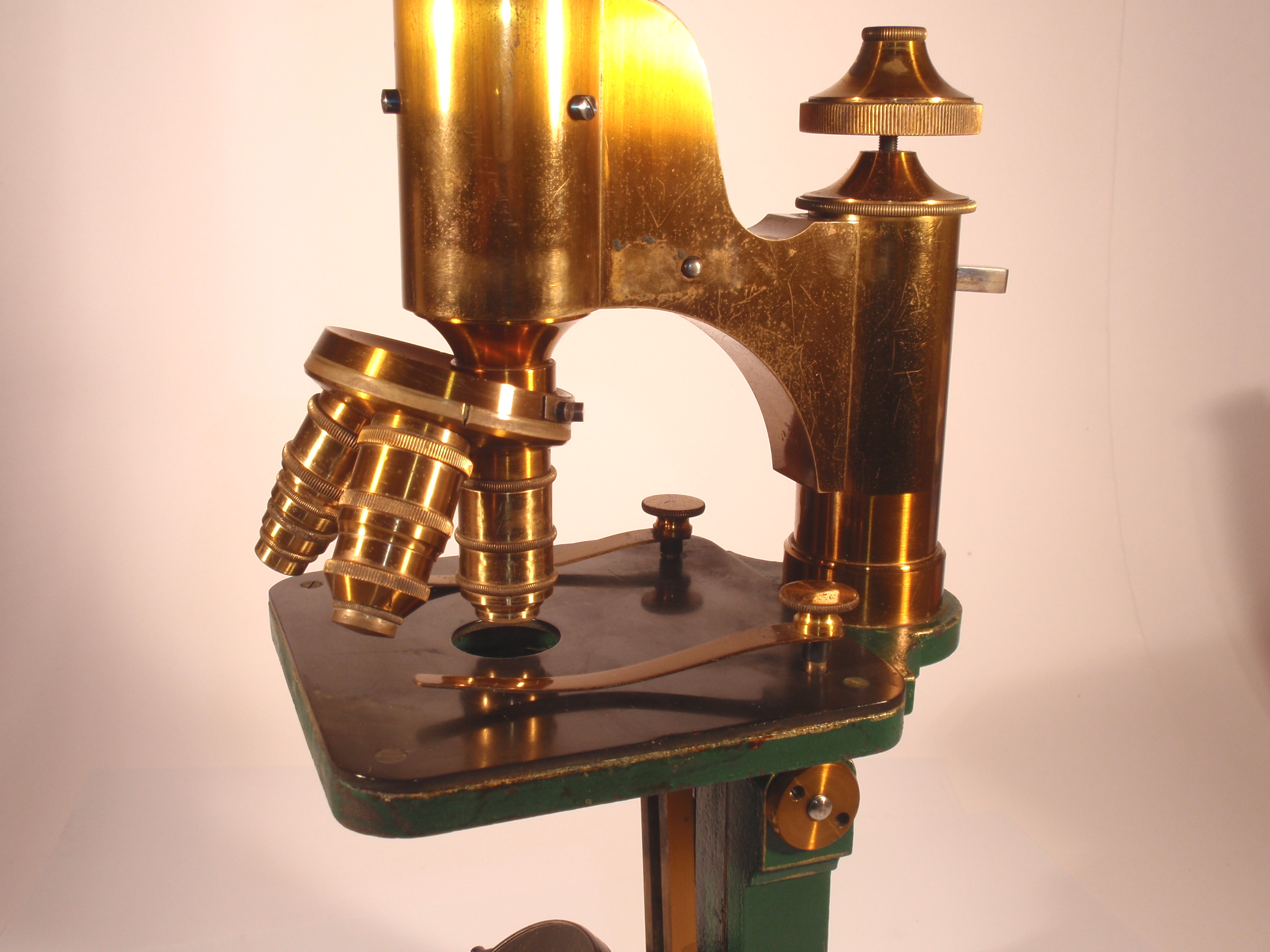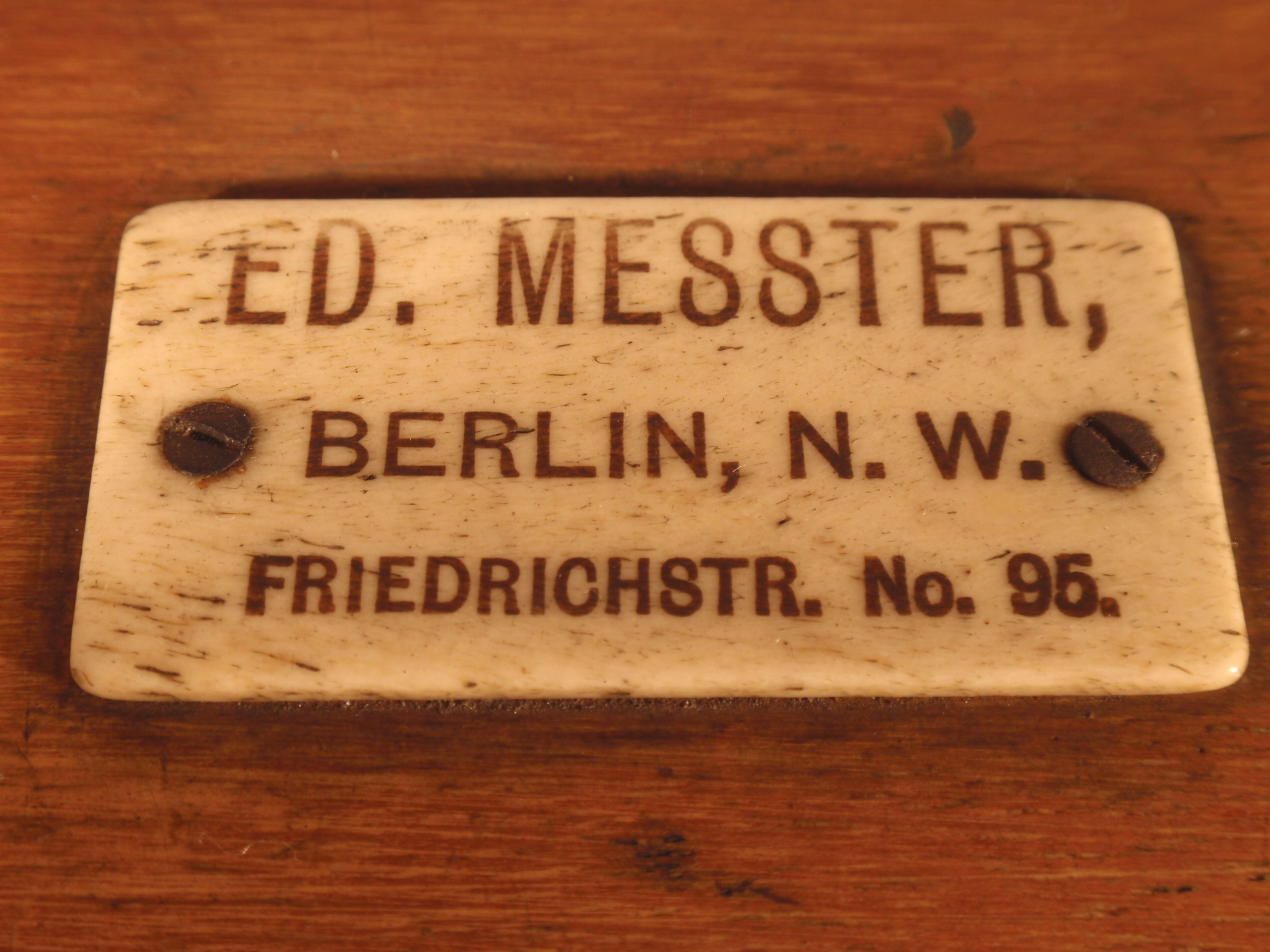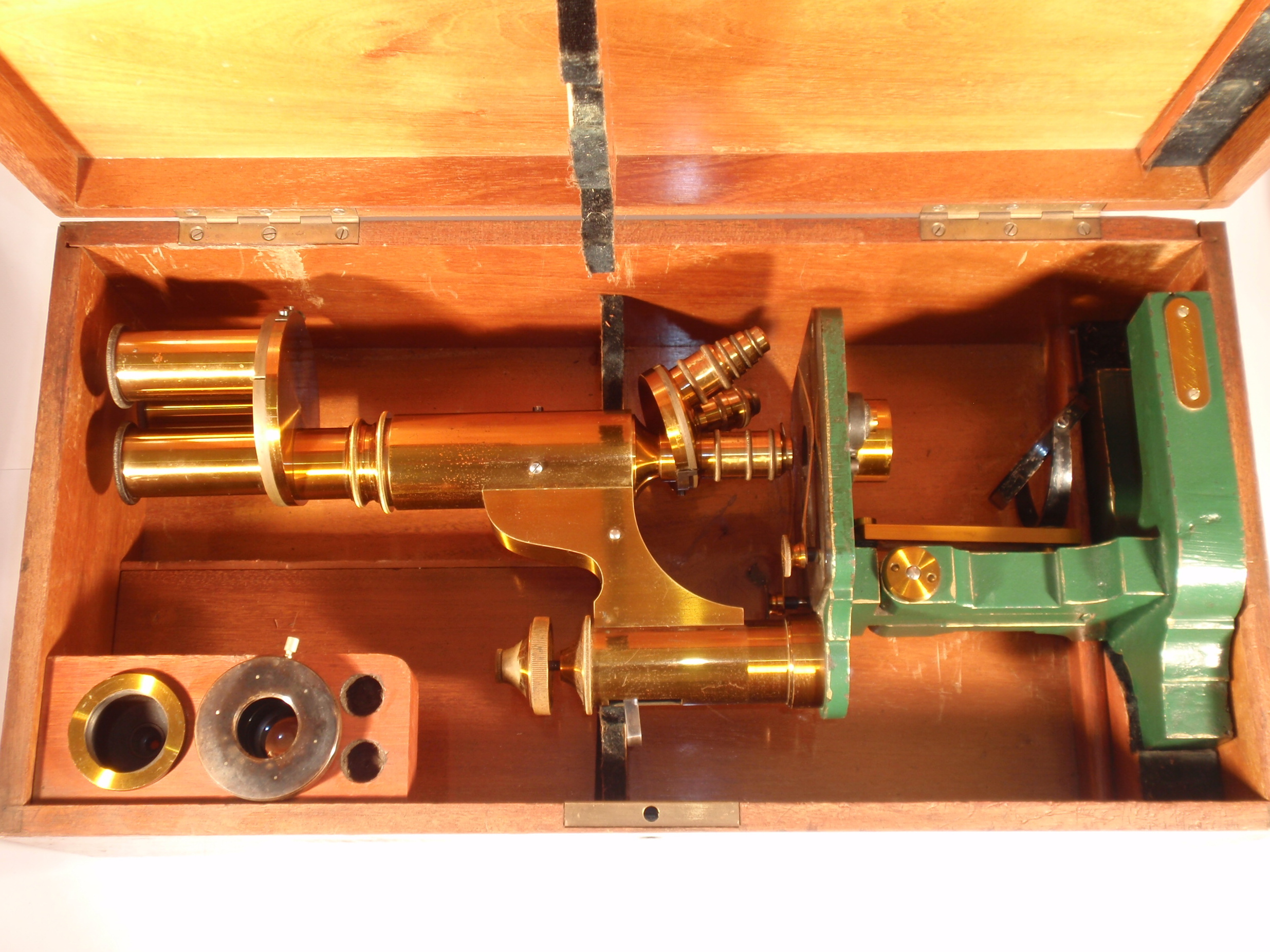Messing mit grünem Eisenfuß, original zaponiert und grün lackiert, ca. 1859 - 1868, Höhe 38 cm, 3 Okulare (Nr. 1, 2 und 4), 3 Objektive (4, 7 und 1 Ölimmersion), 3fach-Objektivrevolver, 3fach-Okularrevolver,ohne Grobeinstellung, Feineinstellung per Rändelschraube und - ungewöhnlich - mit Hilfe des Hebels hinter der Säule, Kippstativ, schwenkbarer Kondensor, zusätzlich ein Kondensoreinsatz für Lochblenden; auf dem Messingschild am Fuß steht "ges. geschützt"; obwohl nicht signiert, stammt das Instrument aus der Werkstatt von Edmund Meester aus Berlin; es ist sein großes "Bacterienmikroskop"; mechanisch und optisch gut bis sehr gut, Erhaltung sehr gut, schöner Kasten mit einem Elfenbein(-farbenen)-Schild "Ed. Messter, Berlin, N. W. Friedrichstr. No. 95.". - Messter gründete seine Werkstatt 1859. 1868 fand ein Umzug in die Friedrichstr. 99 statt. Das Produktionsdatum dieses Mikroskops liegt in diesem Zeitraum.