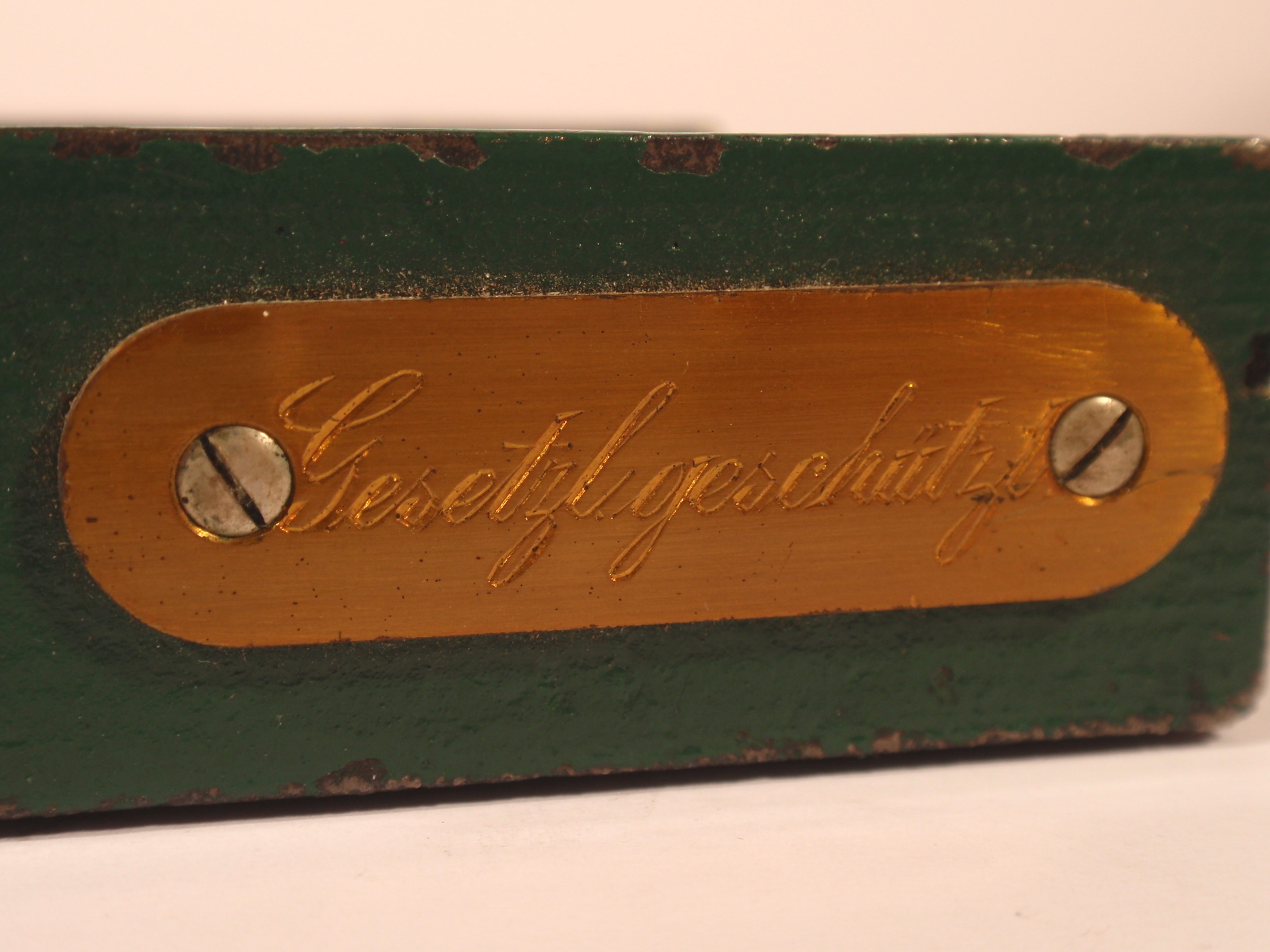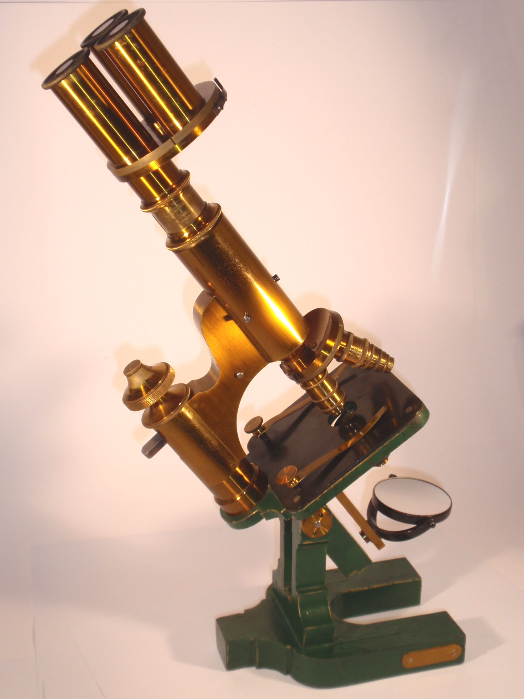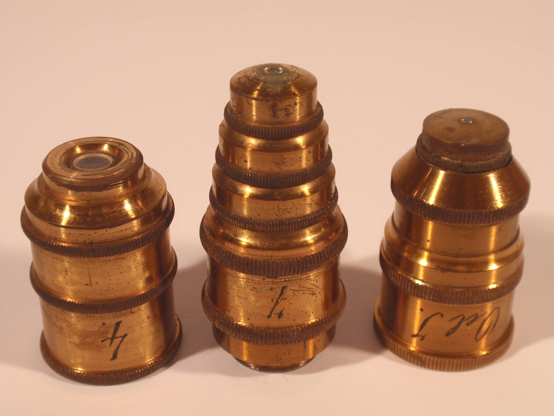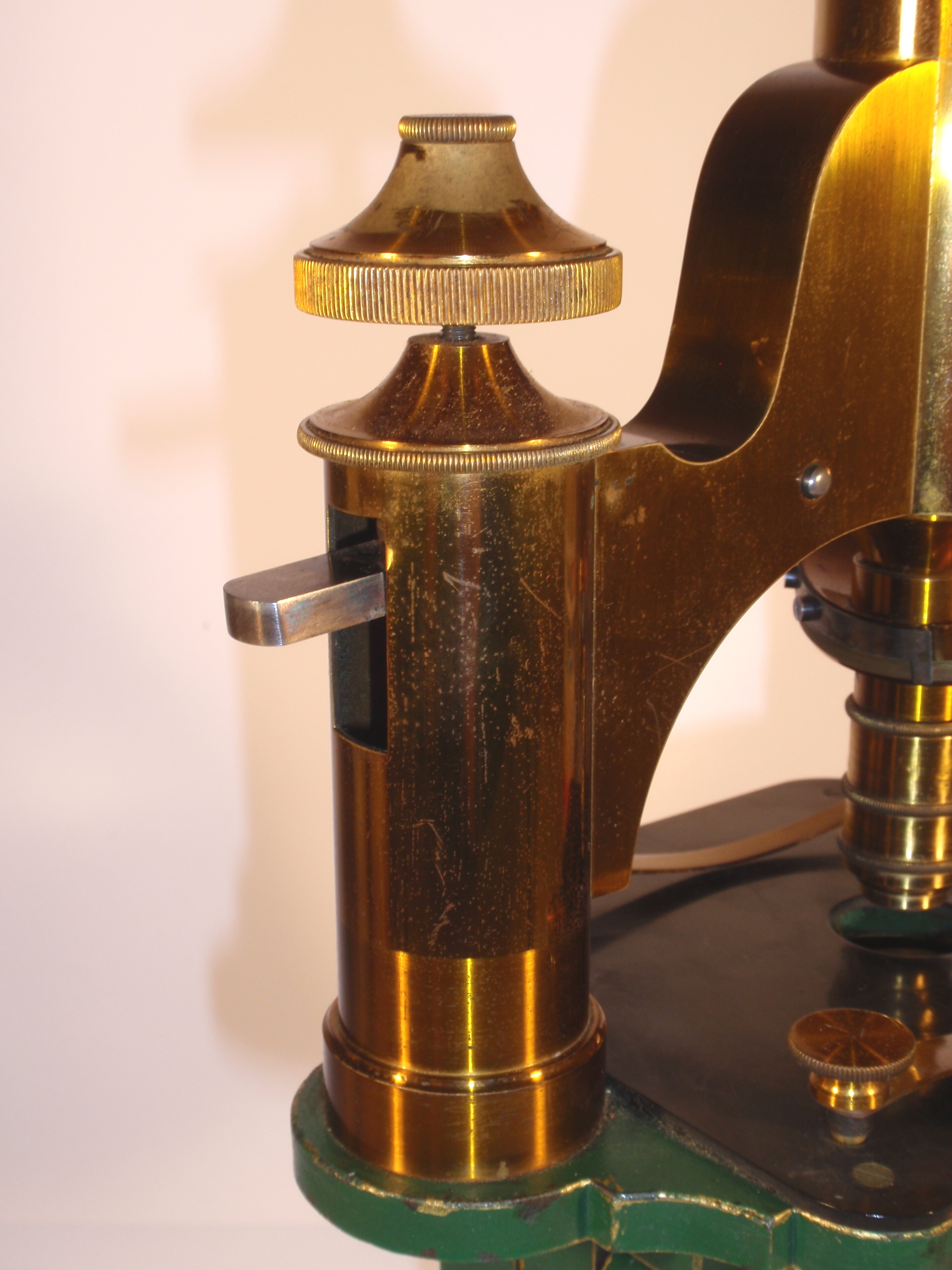 Messing mit grünem Eisenfuß, original zaponiert und grün lackiert, ca. 1859 - 1868, Höhe 38 cm, 3 Okulare (Nr. 1, 2 und 4), 3 Objektive (4, 7 und 1 Ölimmersion), 3fach-Objektivrevolver, 3fach-Okularrevolver,ohne Grobeinstellung, Feineinstellung per Rändelschraube und - ungewöhnlich - mit Hilfe des Hebels hinter der Säule, Kippstativ, schwenkbarer Kondensor, zusätzlich ein Kondensoreinsatz für Lochblenden; auf dem Messingschild am Fuß steht "ges. geschützt"; obwohl nicht signiert, stammt das Instrument aus der Werkstatt von Edmund Meester aus Berlin; es ist sein großes "Bacterienmikroskop"; mechanisch und optisch gut bis sehr gut, Erhaltung sehr gut, schöner Kasten mit einem Elfenbein(-farbenen)-Schild "Ed. Messter, Berlin, N. W. Friedrichstr. No. 95.". - Messter gründete seine Werkstatt 1859. 1868 fand ein Umzug in die Friedrichstr. 99 statt. Das Produktionsdatum dieses Mikroskops liegt in diesem Zeitraum.