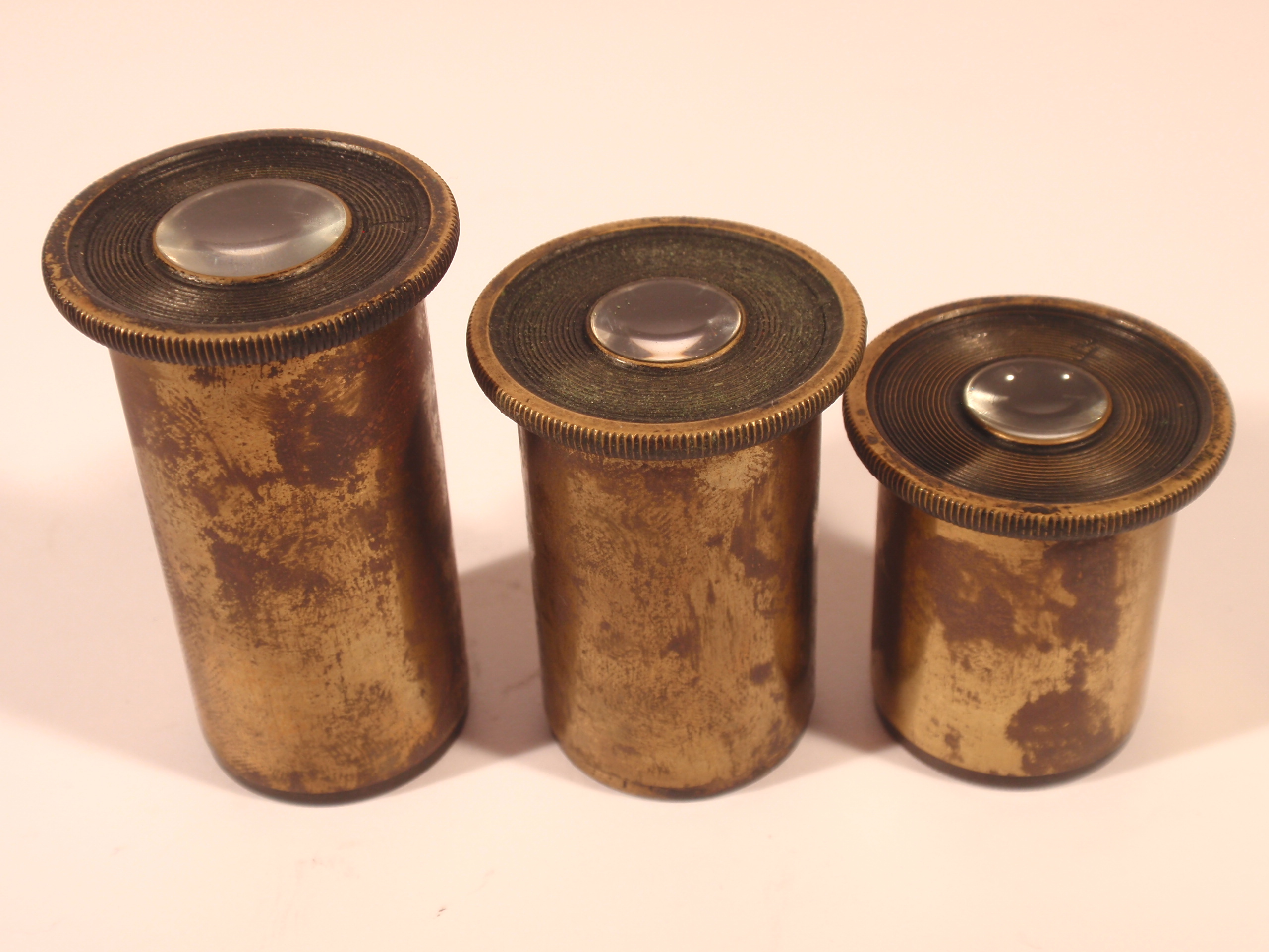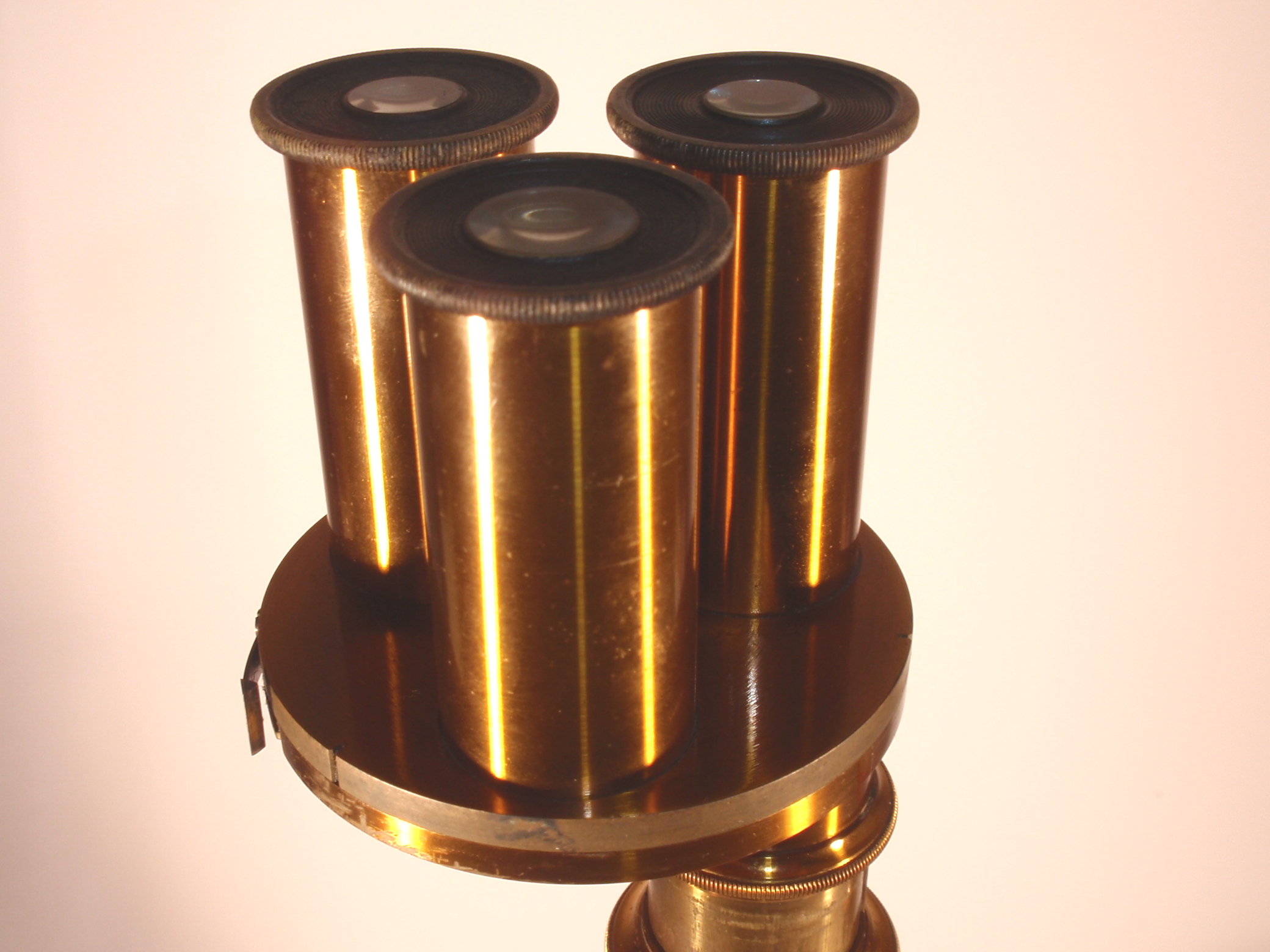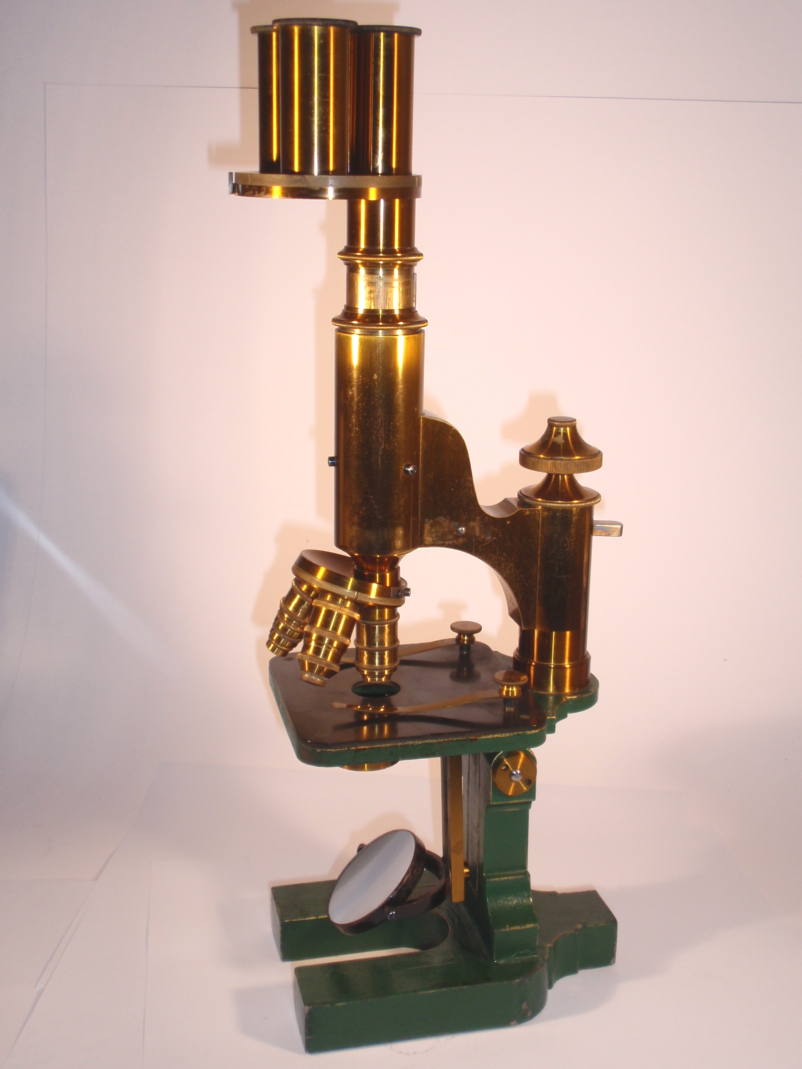 Unusual and huge Microscope with rare triple ocular nosepiece by Messter of Berlin, brass with iron foot, original lacquered and the base green coloured, before 1870, hight 15" (38 cm), 3 oculars (No. 1, 2, and 4), 3 objevtives (No. 4, 7, and one oil-immersion), triple nosepiece for objektives and the oculars! Fine focusing, and one pivoted lever behind the column for focusing as well, lifting tripod, swivelling condenser, a plaque on the foot "legally protected", although not signed is this instrument made by "Ed. Messter" at Berlin; it is his so called "Bacterienmikroskop"; mechanically and optically very good, cosmetically very good! Beautiful box with an ivory(?) plaque "Ed. Messter, Berlin, N. W. Friedrichstr. No. 95".