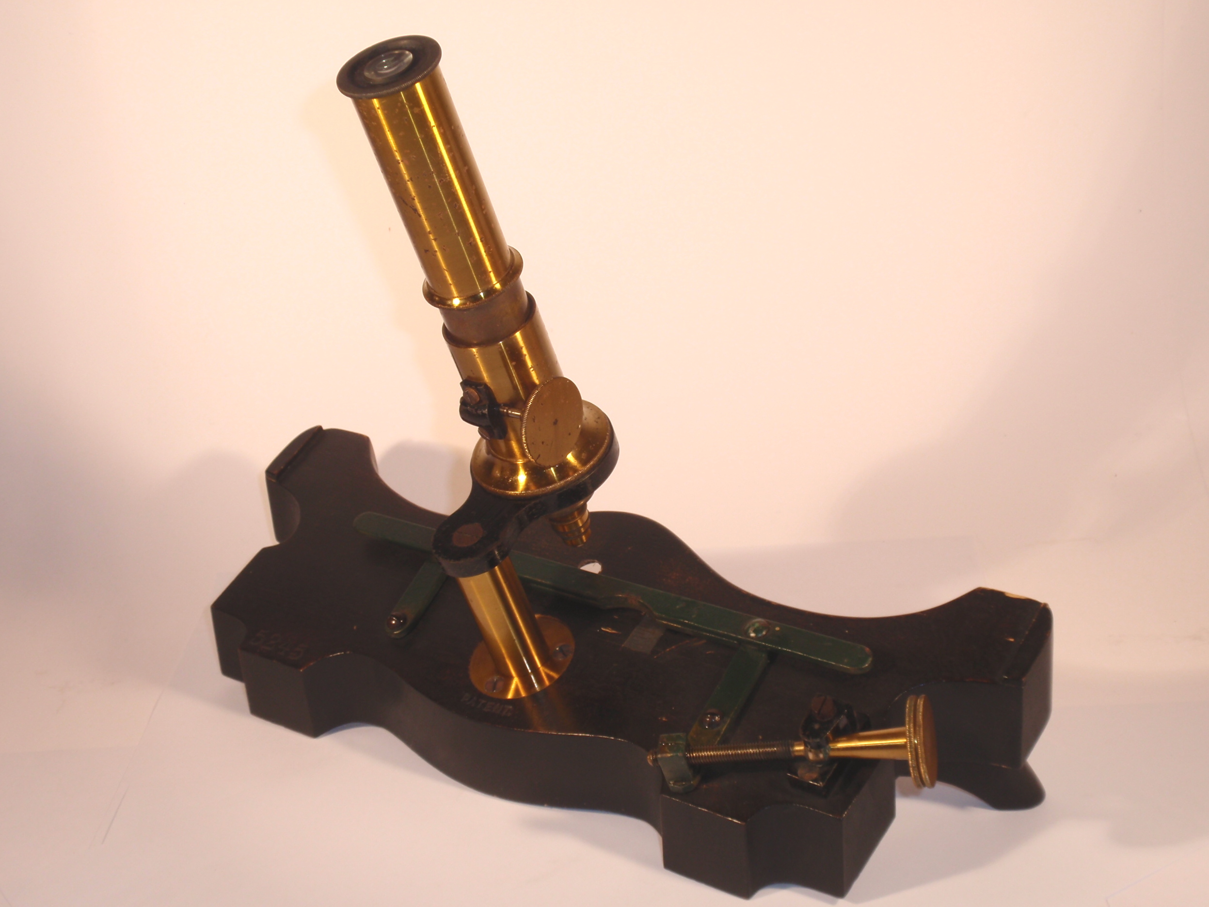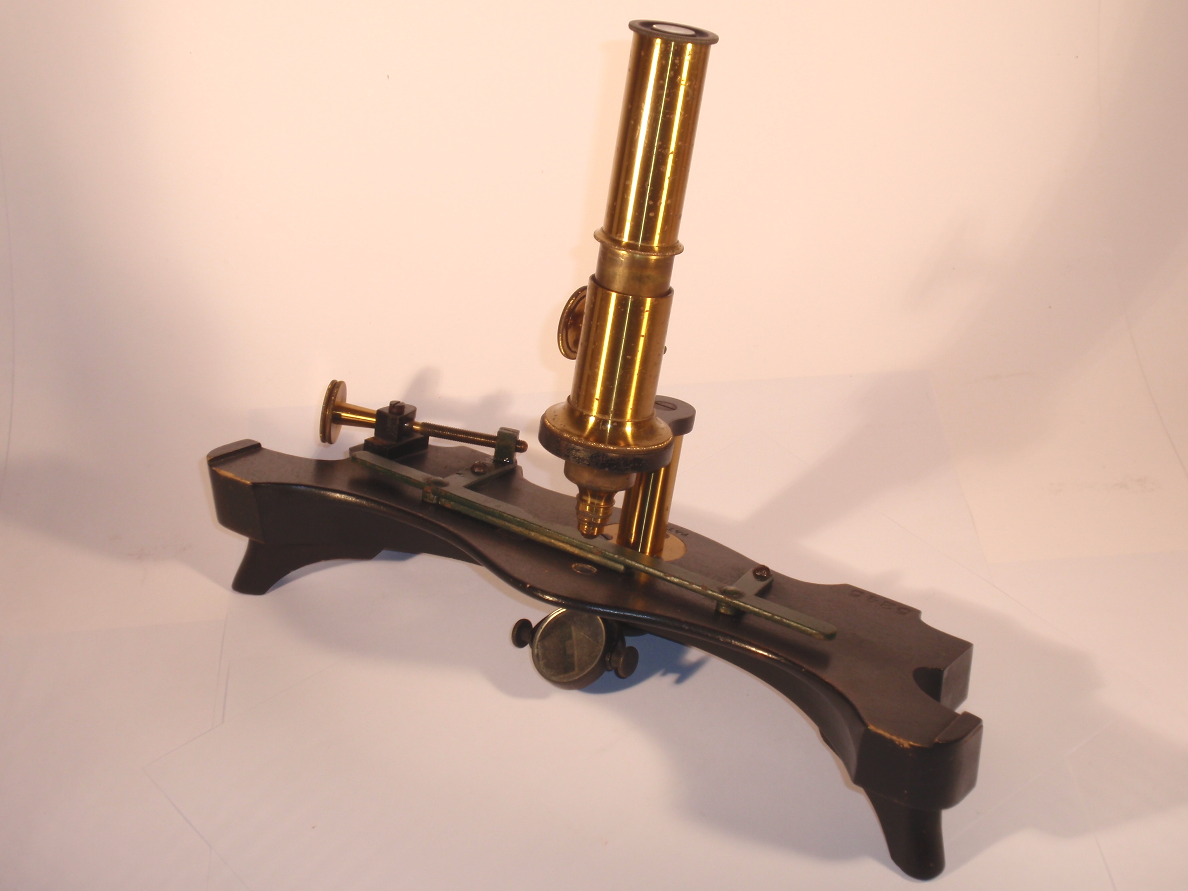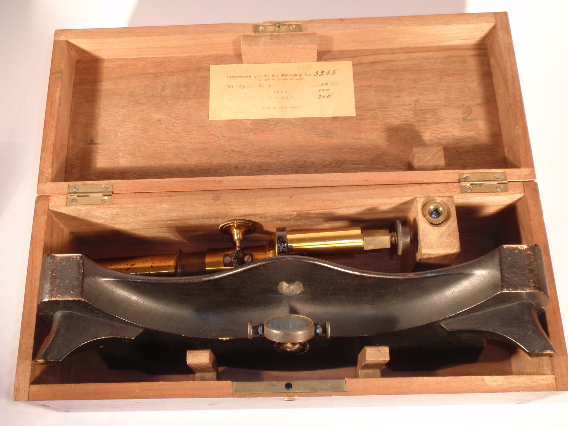 Messing mit geschwärztem Hartholztisch, Messingteile original zaponiert, ca. 1890 - 1910, Höhe 21 cm; ein dreiteilig kombinierbares Objektiv; ein Okular; Grob- und Feineinstellung durch einen Trieb; die Vergrößerungstabelle im Kasten spricht von 50-, 100- und 200facher Vergrößerung, auf dem Tisch eingestanzt die Nummer "5.245"; dieselbe Nummer findet sich auf der Vergrößerungstabelle; die in einem Kompressorium befindlichen Objekte werden durch die Rändelschraube rechts am Tisch bewegt; obwohl ohne Signatur stammt das Mikroskop zweifelsfrei aus der Werkstatt von Wilhelm Teschner; mechanisch und optisch gut, Erhaltung gut; schöner Kasten. - 1806 gründete Joseph Amuel eine feinmechanische Werkstatt. 1866 übernimmt W. Teschner diese Firma und baut seitdem Mikroskope. Teschner war Hofoptiker und -mechaniker in Berlin und hat sich mit diesem heute recht selten zu findenden Mikroskop einen Namen gemacht. Er fertigte als Einziger dieses Modell mit dem charakteristischen geneigten, breiten Holztisch.