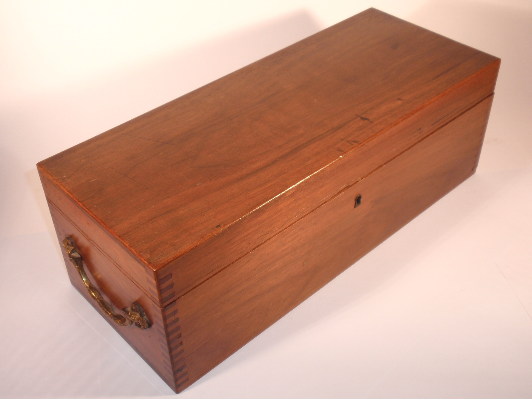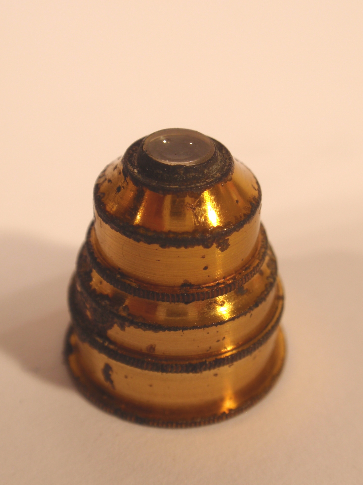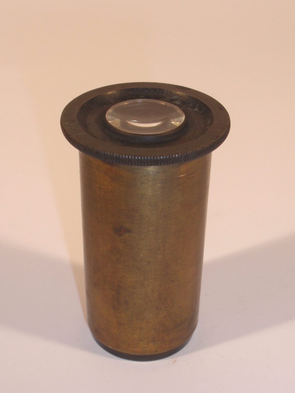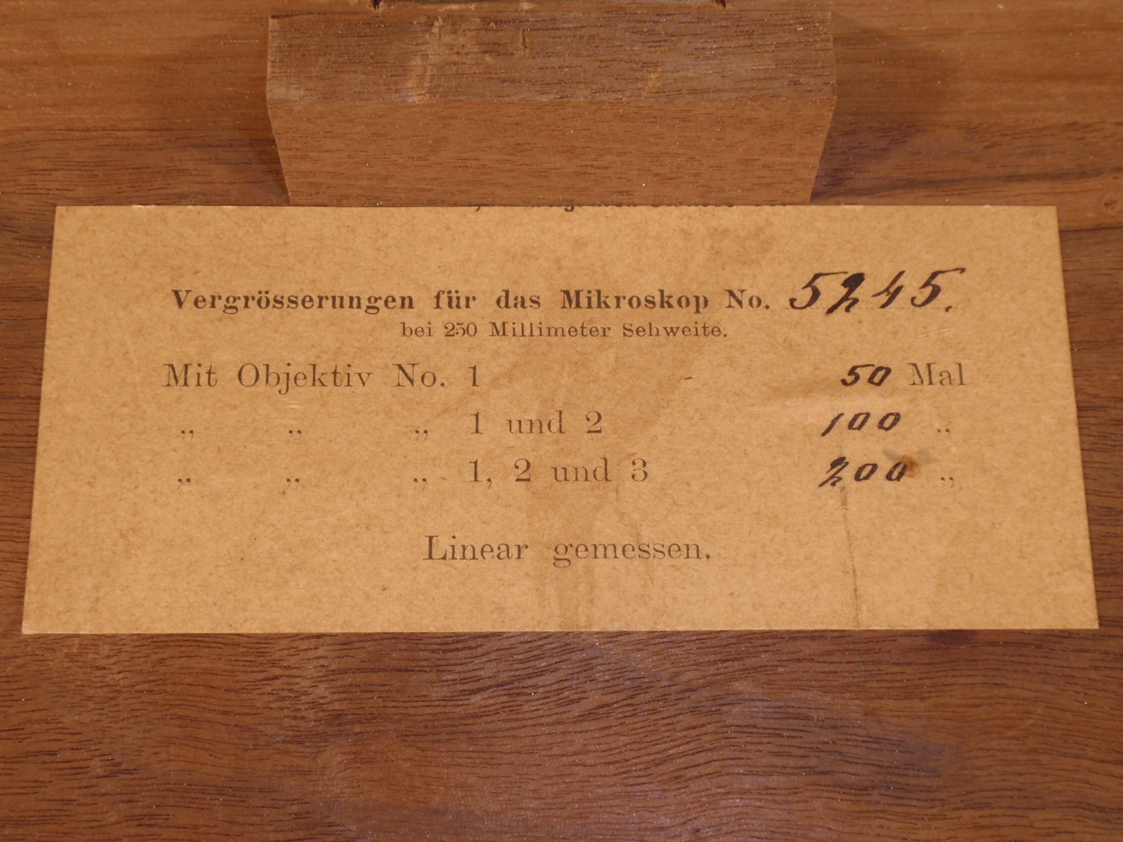 Messing mit geschwärztem Hartholztisch, Messingteile original zaponiert, ca. 1890 - 1910, Höhe 21 cm; ein dreiteilig kombinierbares Objektiv; ein Okular; Grob- und Feineinstellung durch einen Trieb; die Vergrößerungstabelle im Kasten spricht von 50-, 100- und 200facher Vergrößerung, auf dem Tisch eingestanzt die Nummer "5.245"; dieselbe Nummer findet sich auf der Vergrößerungstabelle; die in einem Kompressorium befindlichen Objekte werden durch die Rändelschraube rechts am Tisch bewegt; obwohl ohne Signatur stammt das Mikroskop zweifelsfrei aus der Werkstatt von Wilhelm Teschner; mechanisch und optisch gut, Erhaltung gut; schöner Kasten. - 1806 gründete Joseph Amuel eine feinmechanische Werkstatt. 1866 übernimmt W. Teschner diese Firma und baut seitdem Mikroskope. Teschner war Hofoptiker und -mechaniker in Berlin und hat sich mit diesem heute recht selten zu findenden Mikroskop einen Namen gemacht. Er fertigte als Einziger dieses Modell mit dem charakteristischen geneigten, breiten Holztisch.