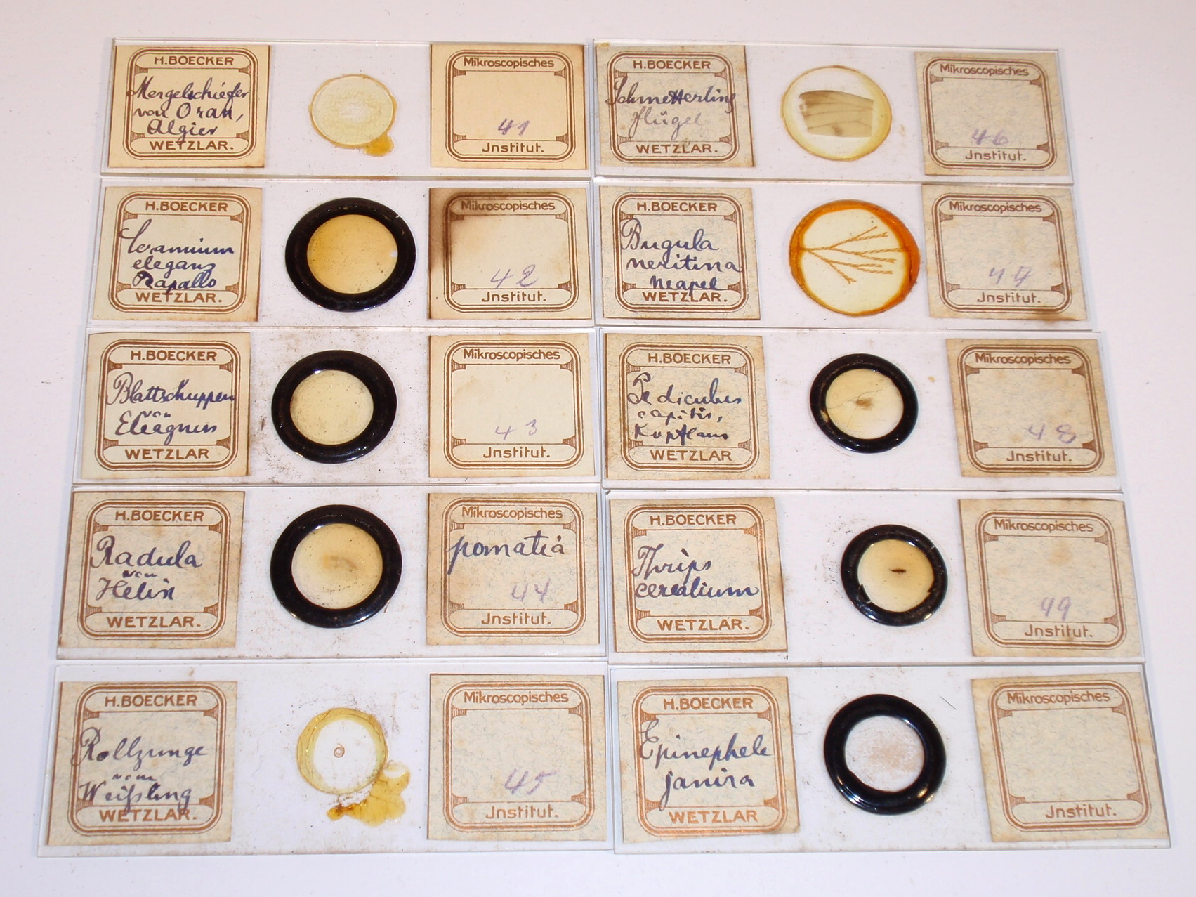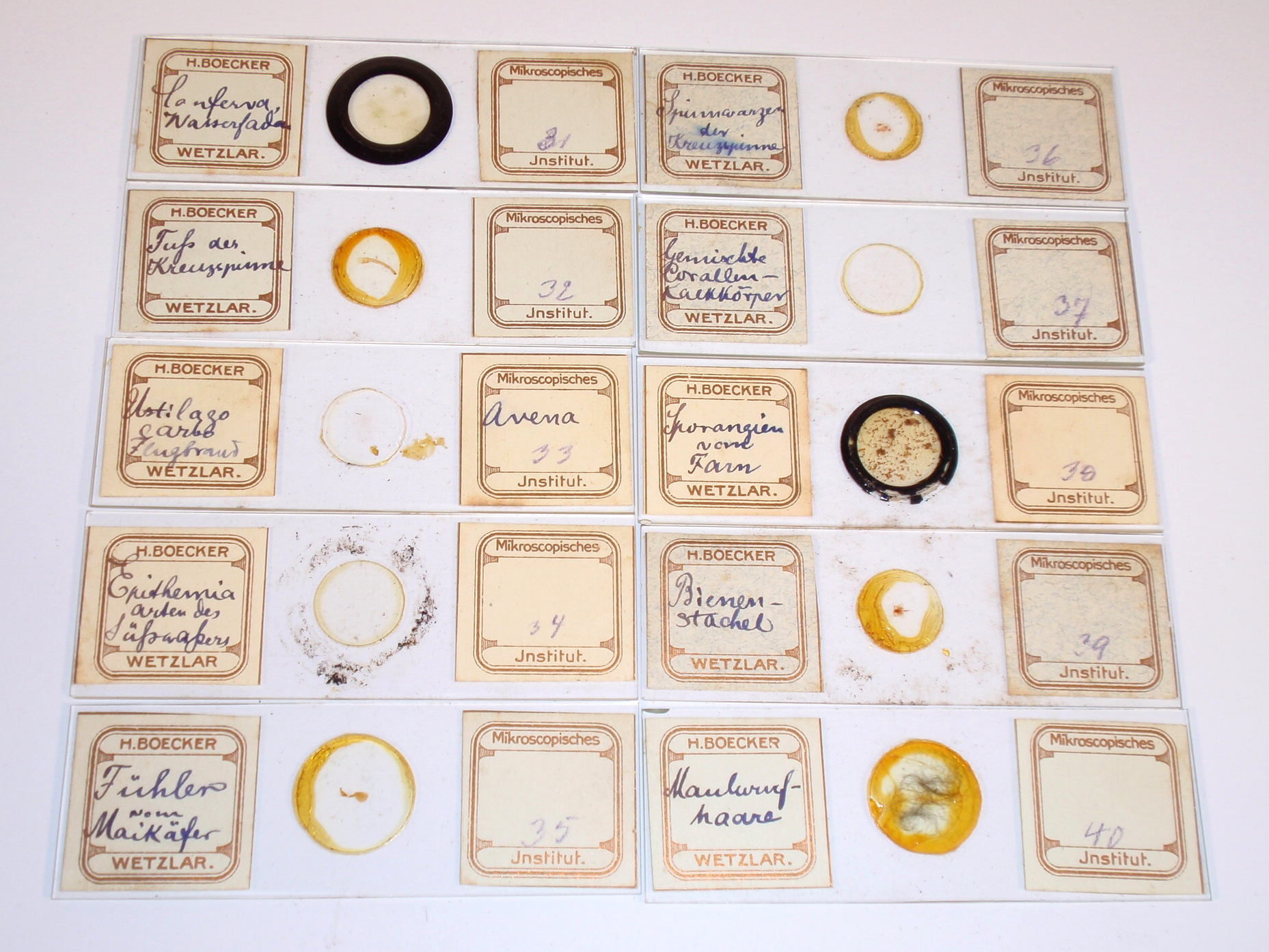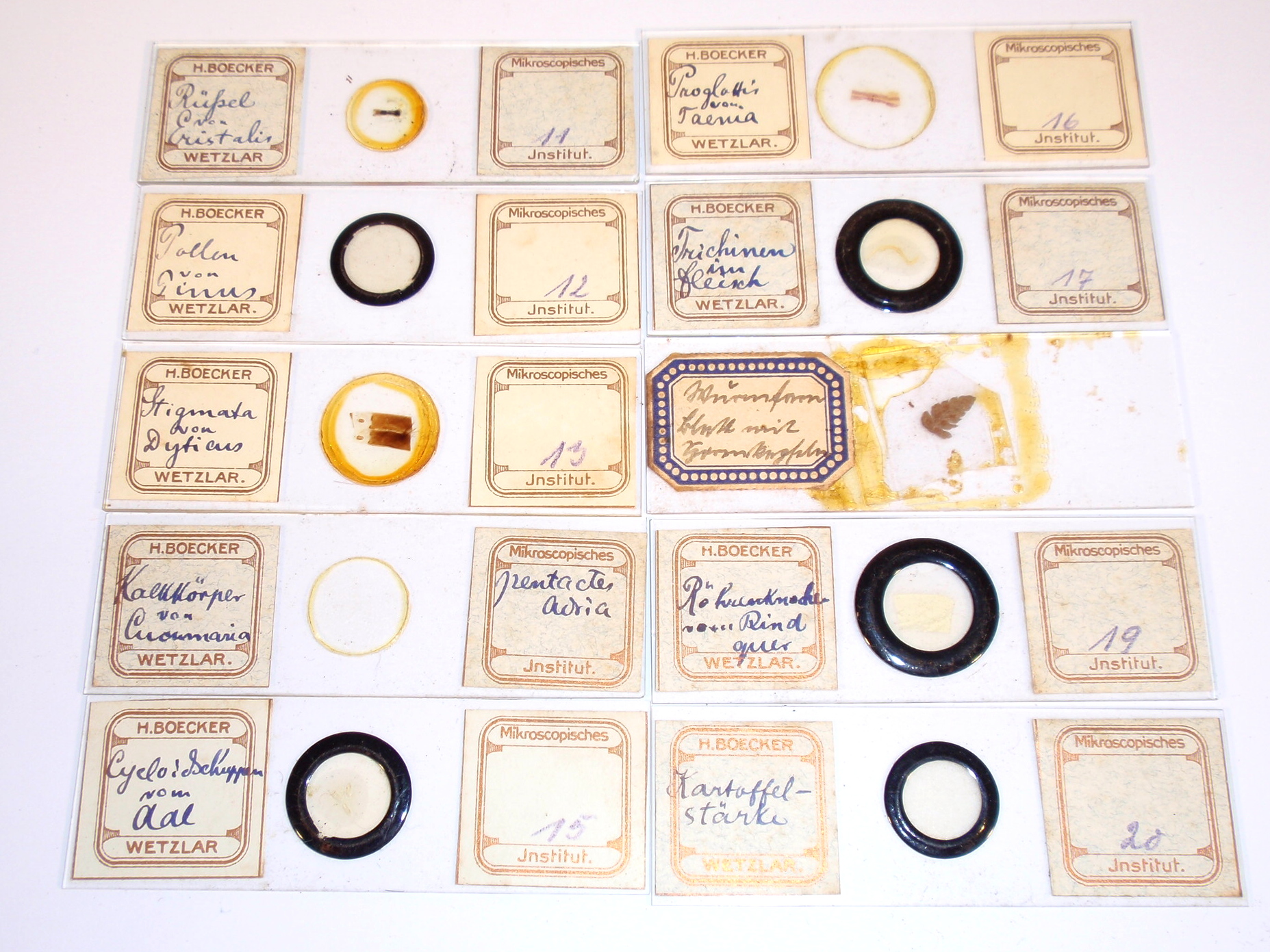 Pappkasten beledert, in Golddruck "Mikroskopische Präparate"; ca. 1890 - 1910; Kastenmaße: 19 x 15 x 4 cm; im Kasten befinden sich 50 Präparate; bis auf eines sind alle von "Heinrich Boecker aus Wetzlar" und mit seinem Etikett versehen, die Präparate sind nummeriert, Nr.18 ist ein Fremdpräparat; die Bilder zeigen alle 50 Präparate, daher erfolgt hier keine Auflistung der Objekte; einige stammen aus dem Mittelmeerraum; guter bis sehr Zustand der Präparate und des Kastens innen und außen; kein Glaspräparat ist gesplittert oder beschädigt. - Heinrich Wilhelm Justus Boecker (1855 - 1927) fertigte in Wetzlar seit 1875 bis zu seinem Ende mikroskopische Präparate.