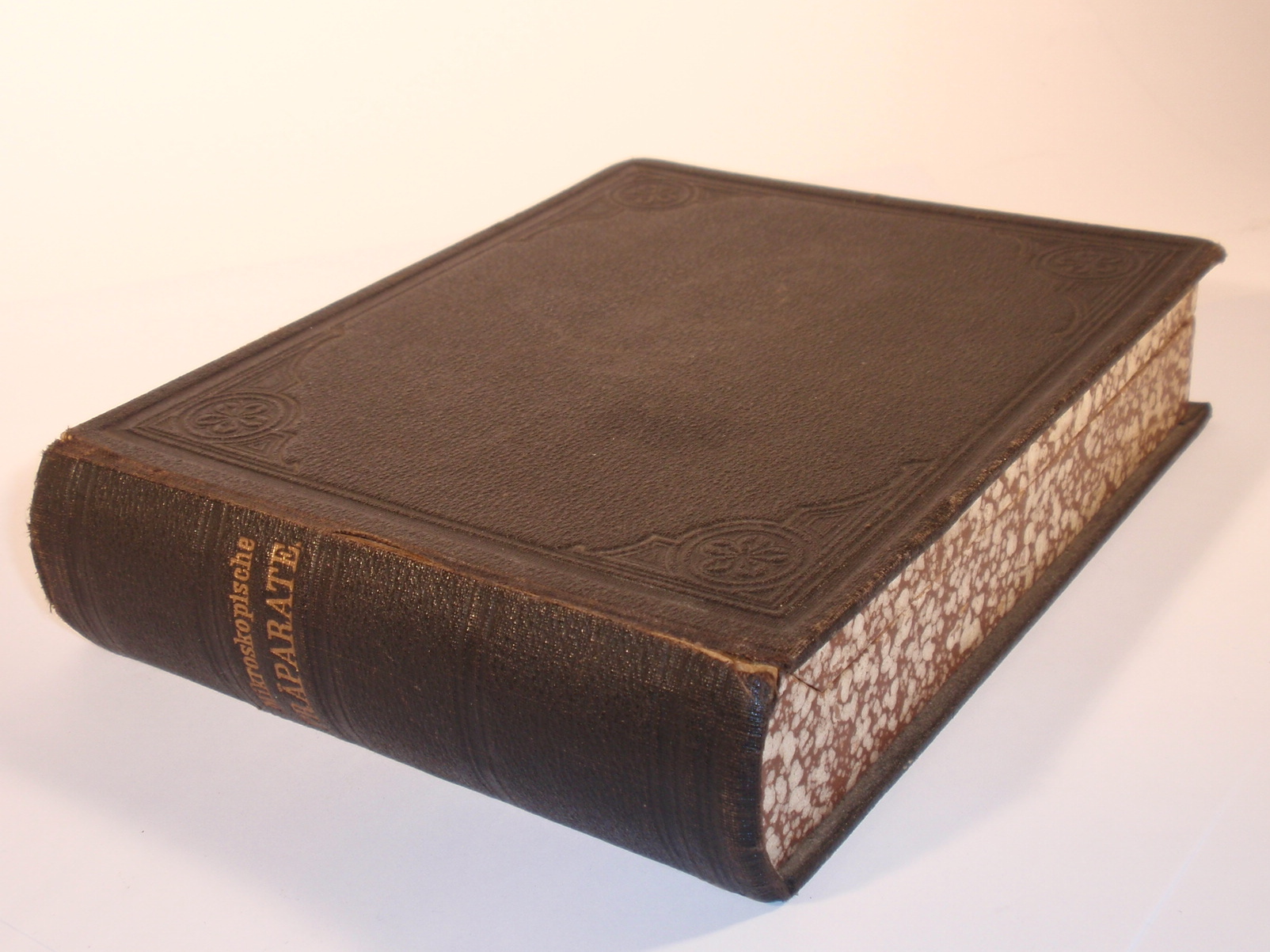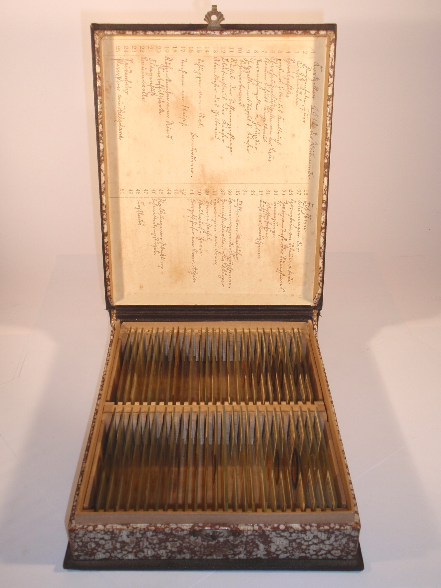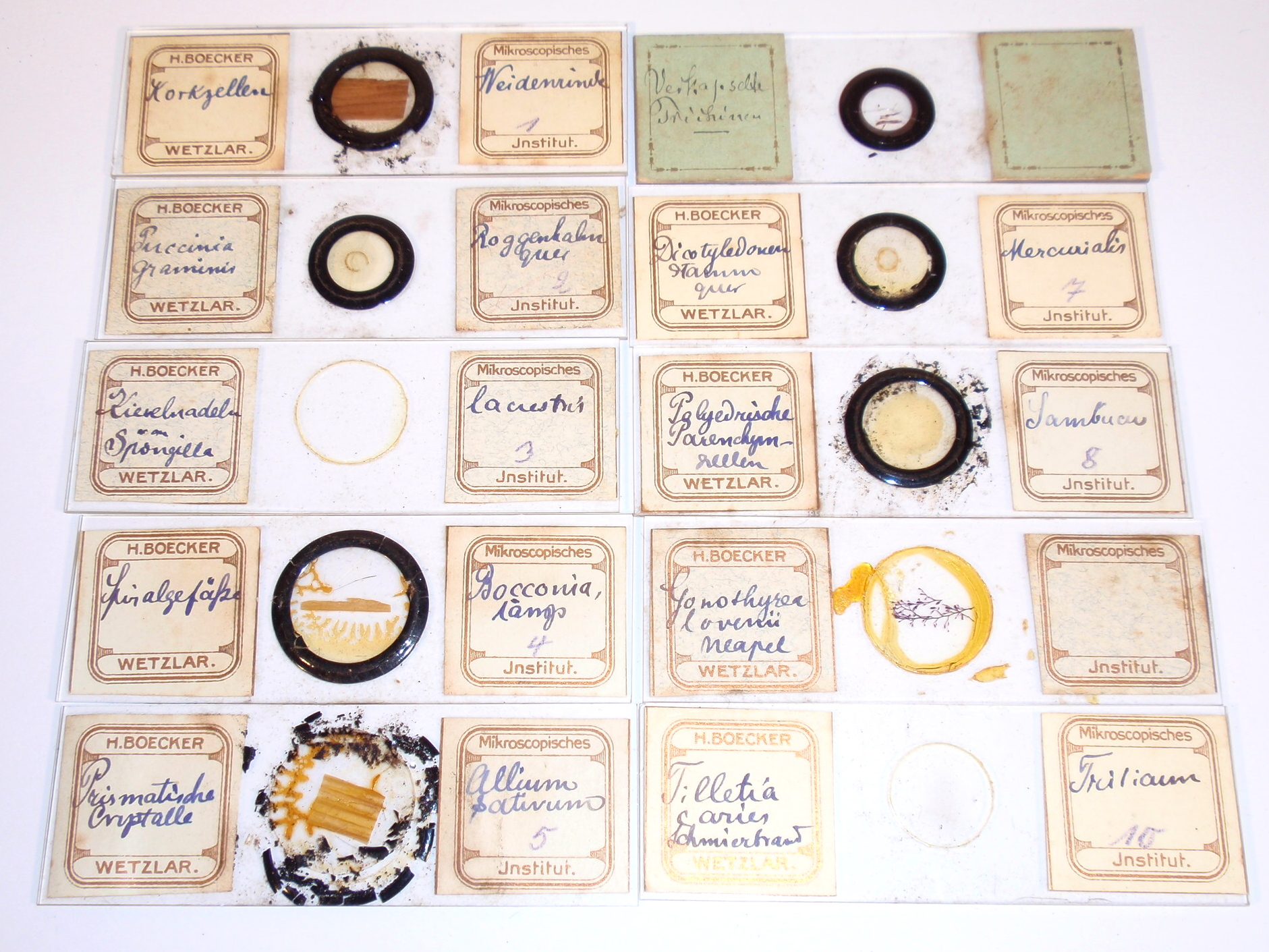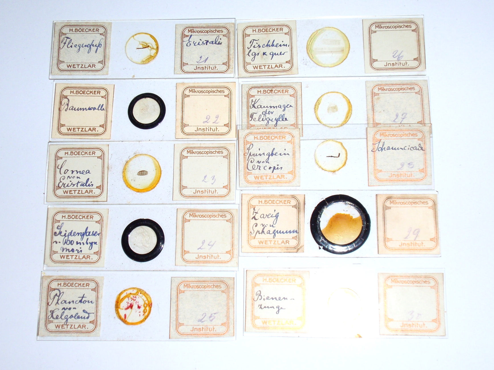 Pappkasten beledert, in Golddruck "Mikroskopische Präparate"; ca. 1890 - 1910; Kastenmaße: 19 x 15 x 4 cm; im Kasten befinden sich 50 Präparate; bis auf eines sind alle von "Heinrich Boecker aus Wetzlar" und mit seinem Etikett versehen, die Präparate sind nummeriert, Nr.18 ist ein Fremdpräparat; die Bilder zeigen alle 50 Präparate, daher erfolgt hier keine Auflistung der Objekte; einige stammen aus dem Mittelmeerraum; guter bis sehr Zustand der Präparate und des Kastens innen und außen; kein Glaspräparat ist gesplittert oder beschädigt. - Heinrich Wilhelm Justus Boecker (1855 - 1927) fertigte in Wetzlar seit 1875 bis zu seinem Ende mikroskopische Präparate.
