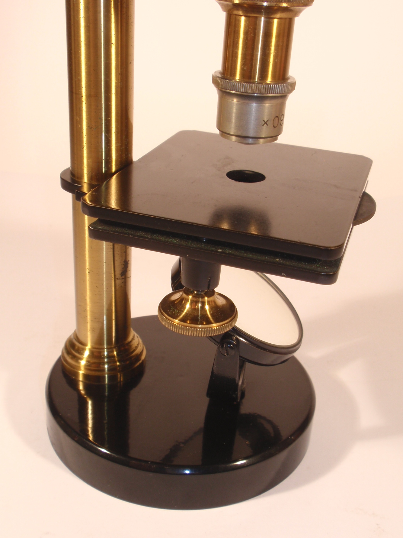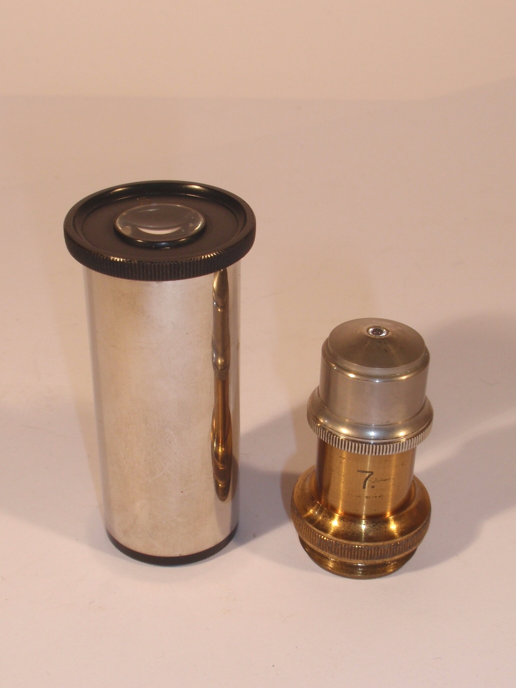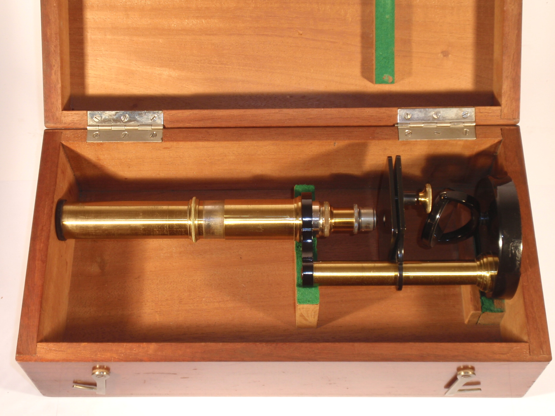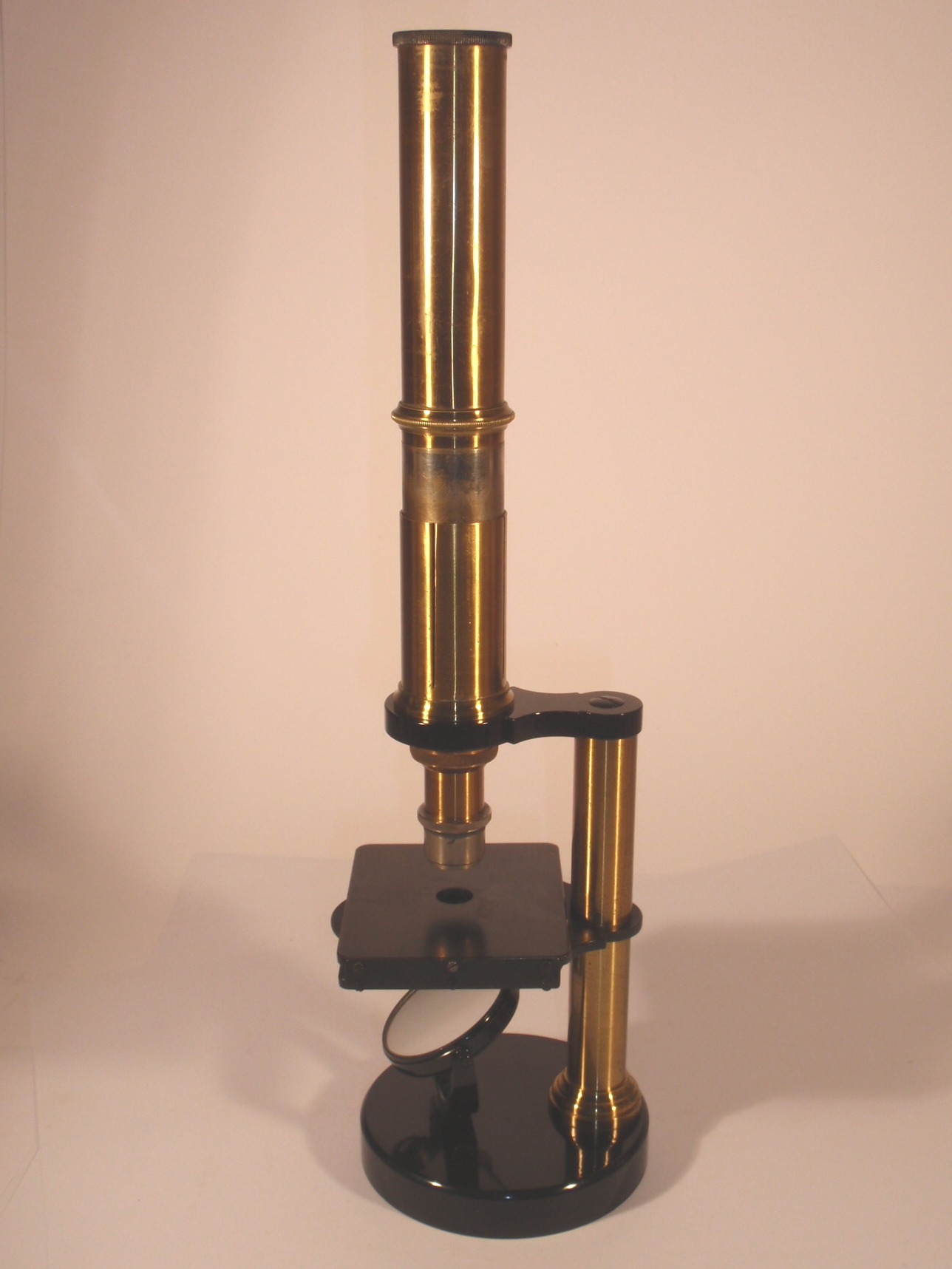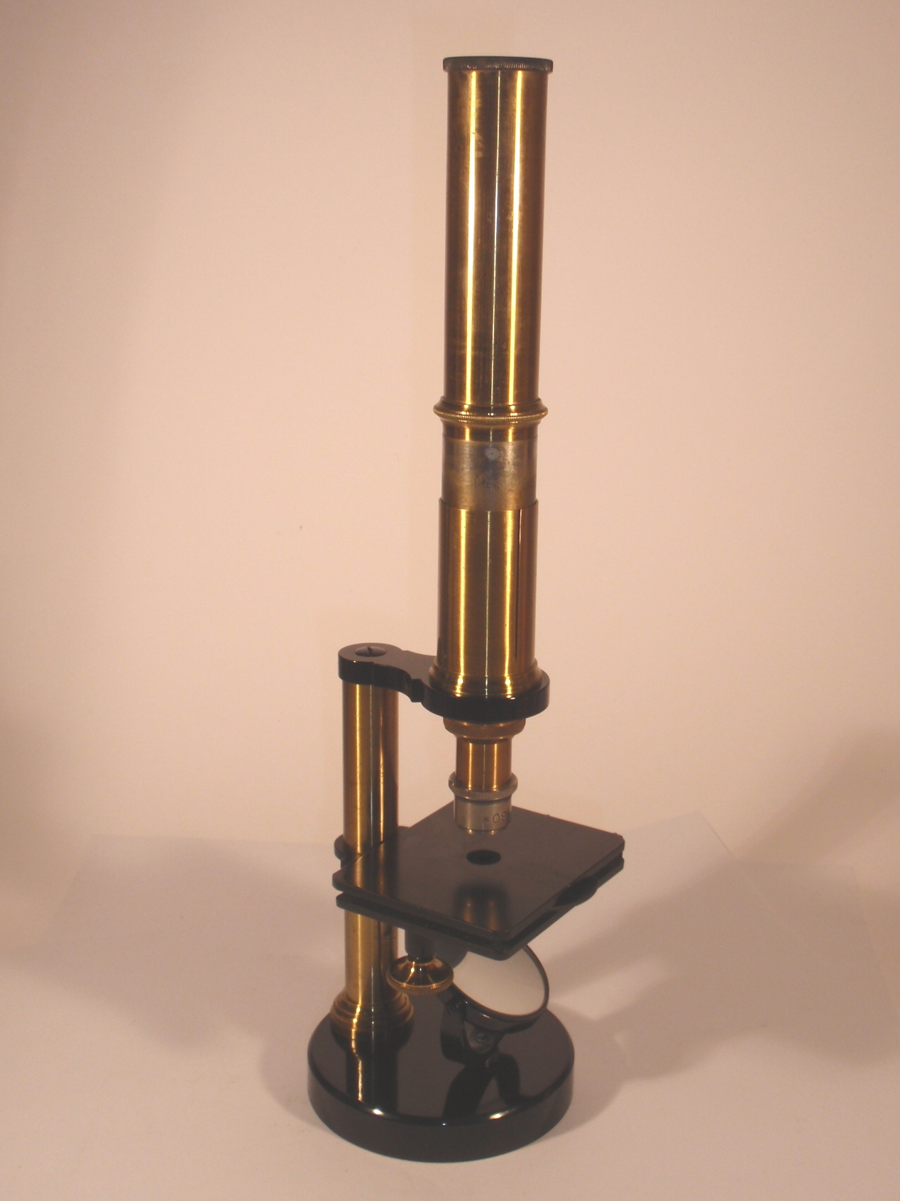 Messing mit schwarz lackiertem Eisenfuß, original zaponiert und geschwärzt, ca. 1880, Höhe wie abgebildet 29 cm; 1 nummeriertes Objektiv (Nr. 7 und "60x"), 1 Okular (Nr. 5), Grobeinstellung durch Verschieben des Tubus, Feineinstellung durch asymmetrisches Heben des Tisches per Rändelschraube seitlich unter dem Tisch, Hohl- und Planspiegel, Lochblendenscheibe unter dem Tisch; mechanisch und optisch sehr gut, Erhaltung sehr gut (offenbar wenig benutzt), sehr schöner Kasten. - Das Mikroskop erinnert zwar an die frühen, kleinen Rundfußmikroskope von Kellner und Belthle, stammt aber sicher nicht aus dem späteren Haus Leitz.