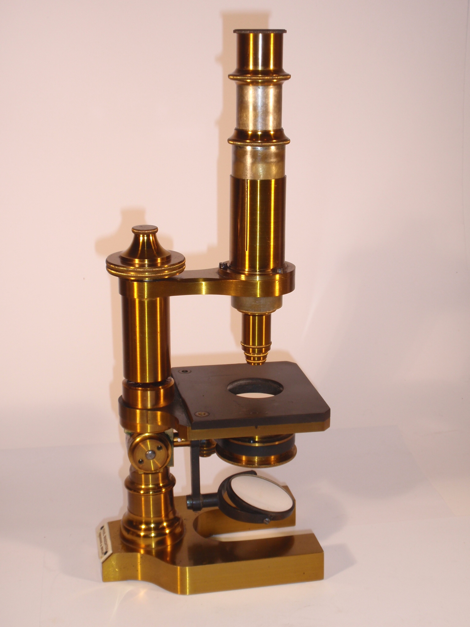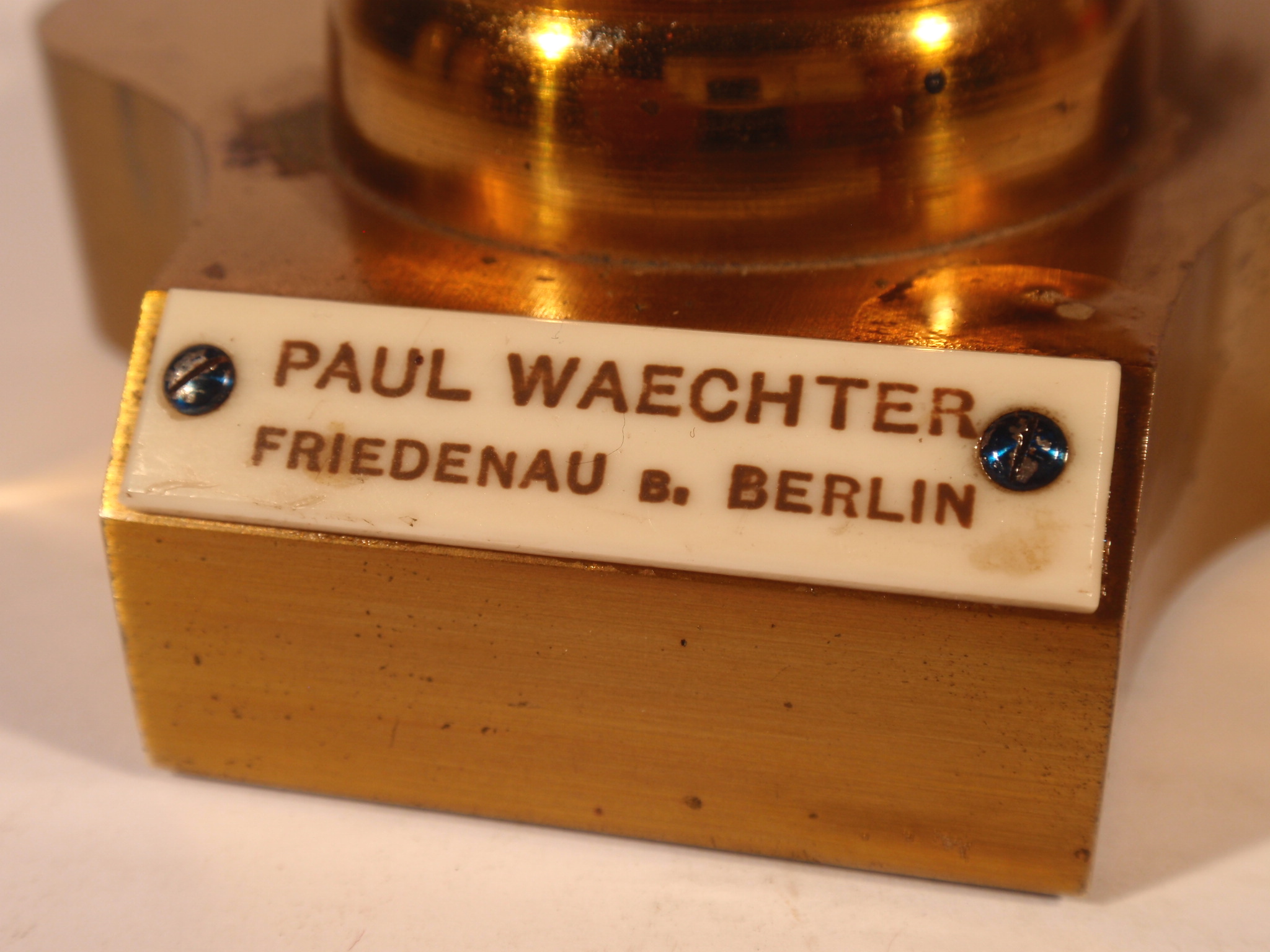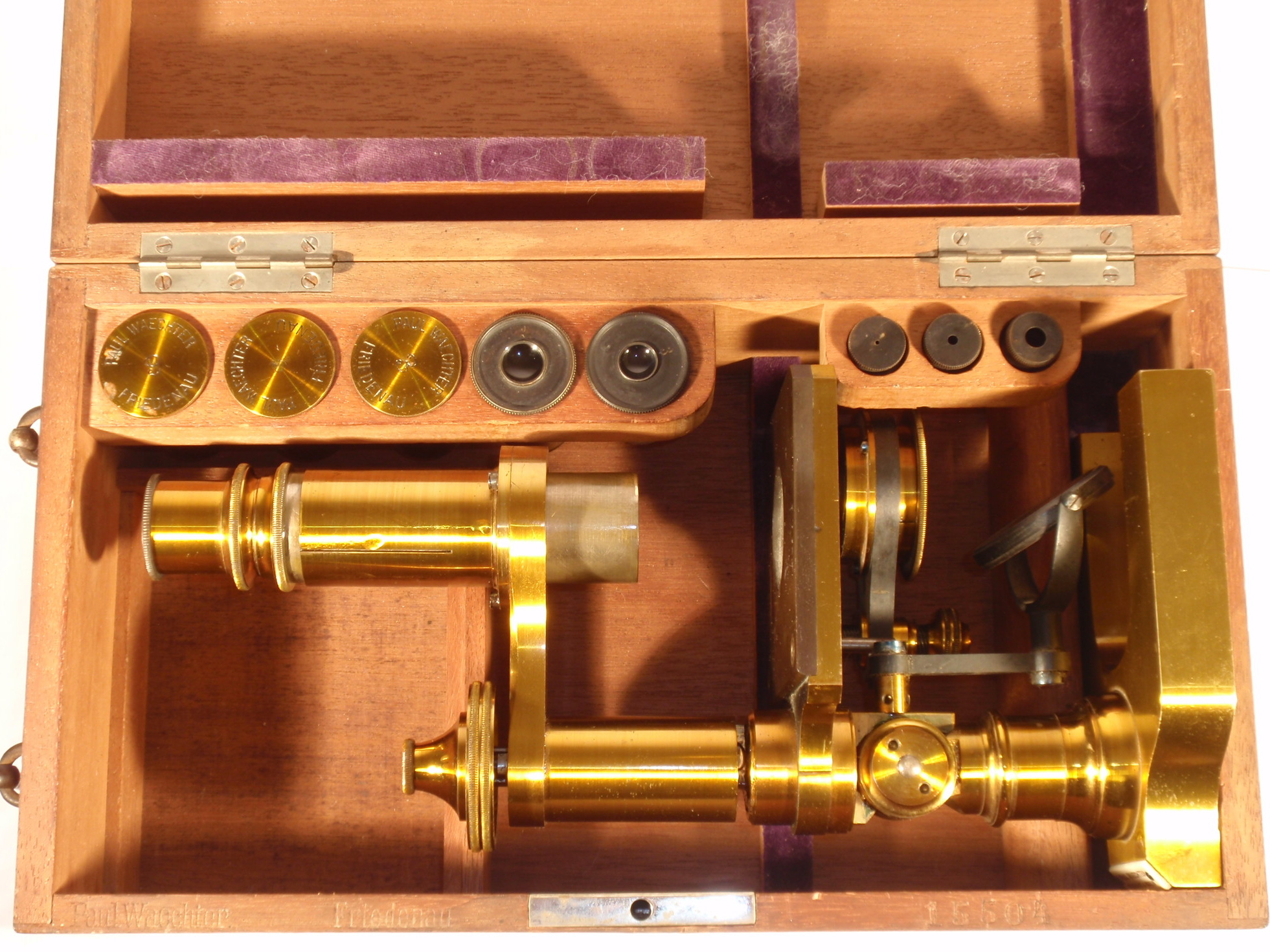 voll Messing, original zaponiert, ca. 1880 - 1885, Höhe 30 cm, 3 Okulare (Nr. 2, 3 und 5), 3 Objektive (Nr. 3, 7 und 9) in signierten Messingdosen, Grobeinstellung durch Verschieben des Tubus, Feineinstellung, schwenkbarer Kondensor mit 3 Lochblenden unter dem Tisch, Kippstativ; Signatur auf einem Elfenbein(?)-Schild am Fuß "Paul Waechter Friedenau B. Berlin"; mechanisch und optisch sehr gut, Erhaltung sehr gut (bestens erhaltene Zaponierung, offenbar wenig benutzt), schöner Kasten mit dem eingestanzten Text "Paul Waechter Friedenau 15.504"; komplett, so wie es ehemals verkauft wurde: alle vorgesehenen Stellen im Kasten sind mit original optischem Zubehör gefüllt.