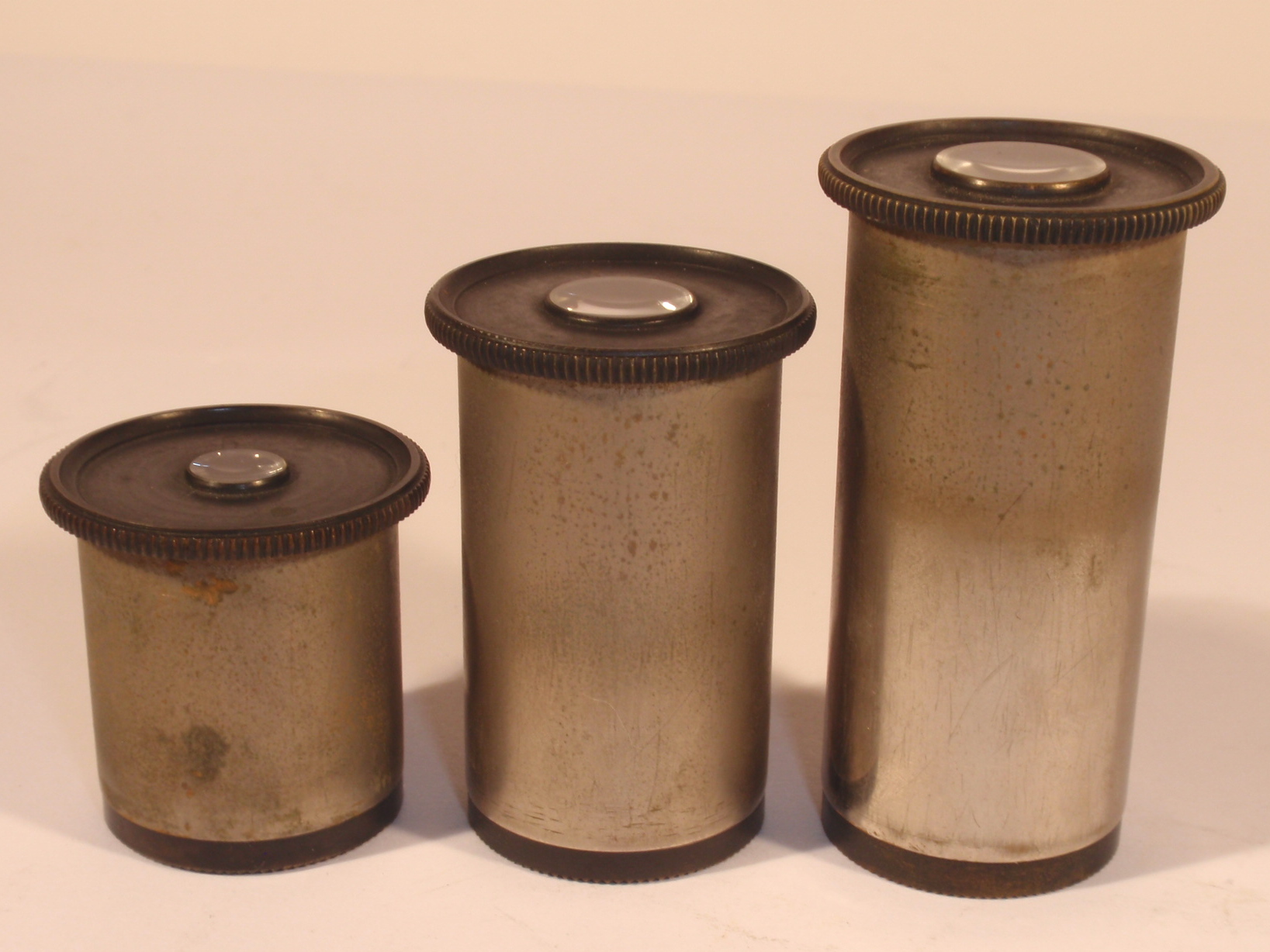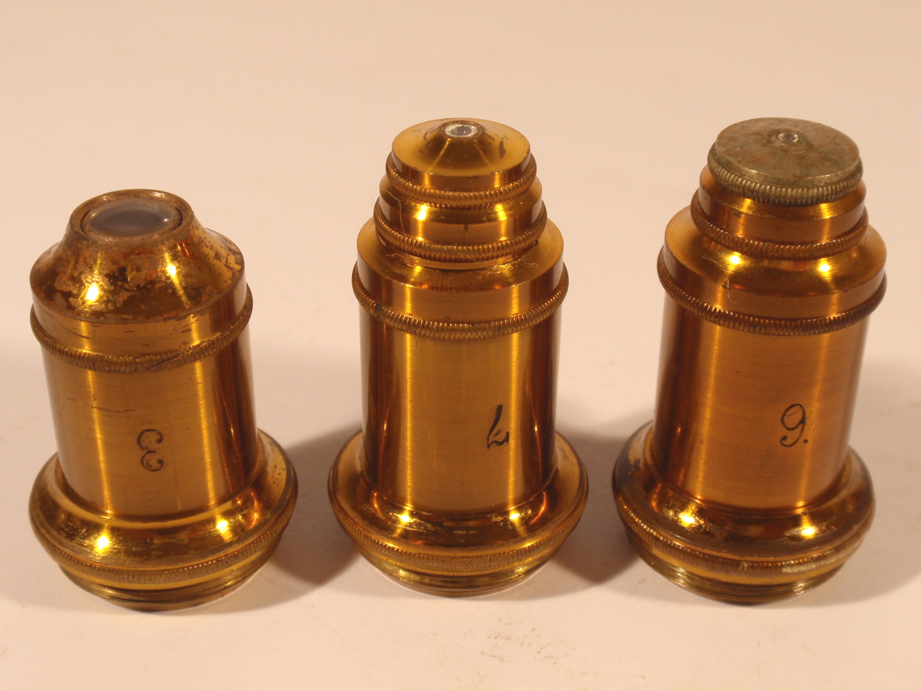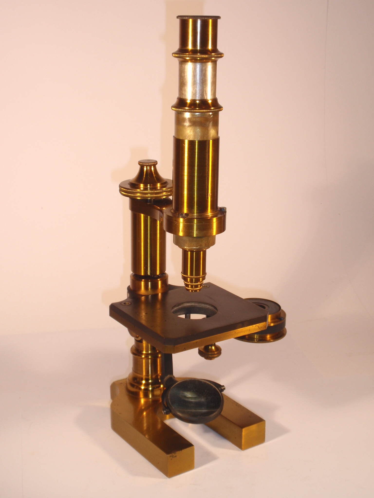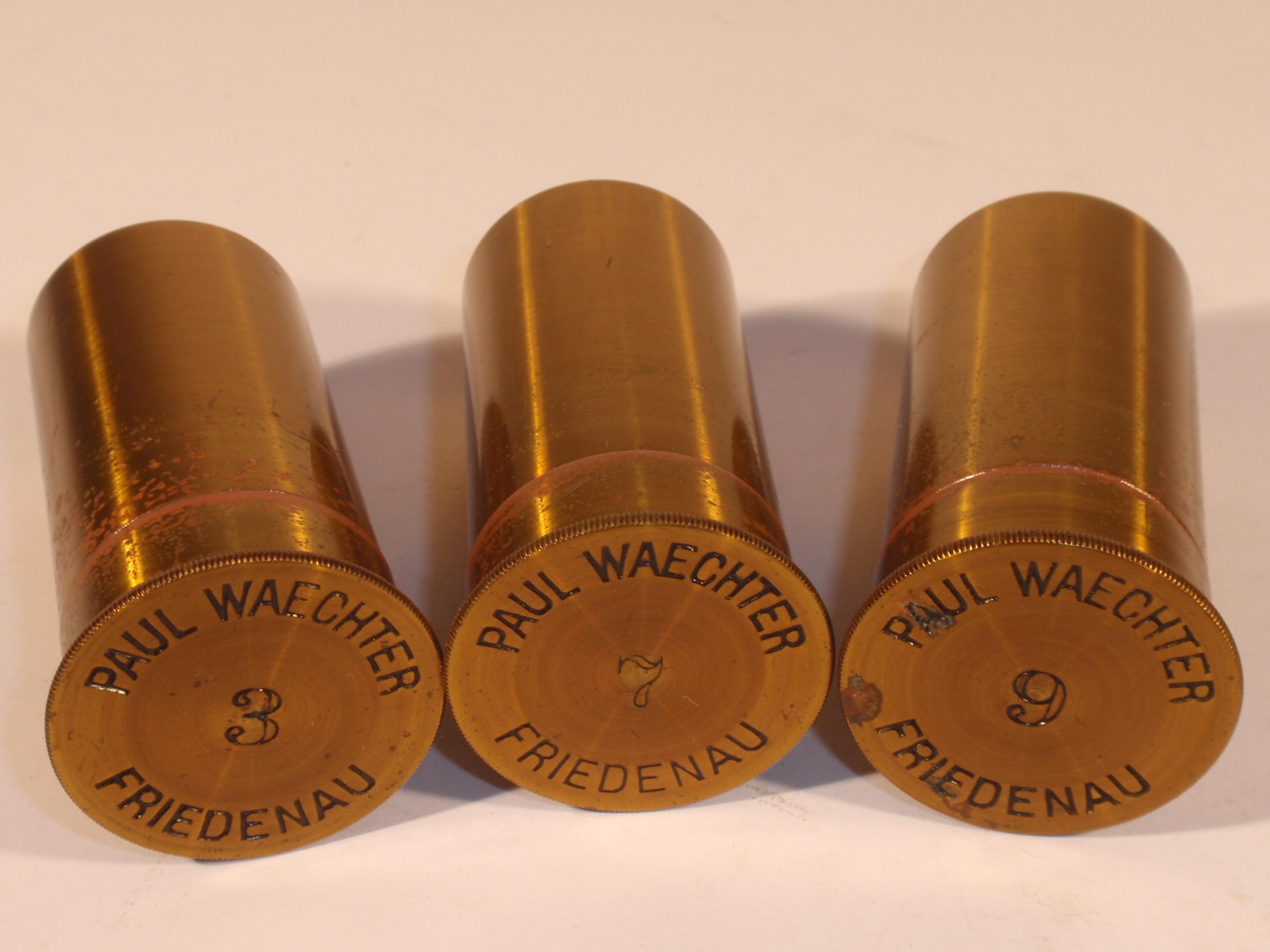 voll Messing, original zaponiert, ca. 1880 - 1885, Höhe 30 cm, 3 Okulare (Nr. 2, 3 und 5), 3 Objektive (Nr. 3, 7 und 9) in signierten Messingdosen, Grobeinstellung durch Verschieben des Tubus, Feineinstellung, schwenkbarer Kondensor mit 3 Lochblenden unter dem Tisch, Kippstativ; Signatur auf einem Elfenbein(?)-Schild am Fuß "Paul Waechter Friedenau B. Berlin"; mechanisch und optisch sehr gut, Erhaltung sehr gut (bestens erhaltene Zaponierung, offenbar wenig benutzt), schöner Kasten mit dem eingestanzten Text "Paul Waechter Friedenau 15.504"; komplett, so wie es ehemals verkauft wurde: alle vorgesehenen Stellen im Kasten sind mit original optischem Zubehör gefüllt.
