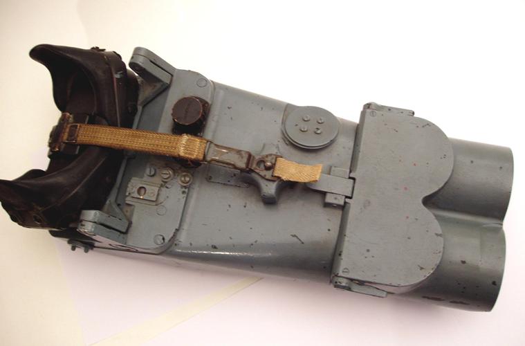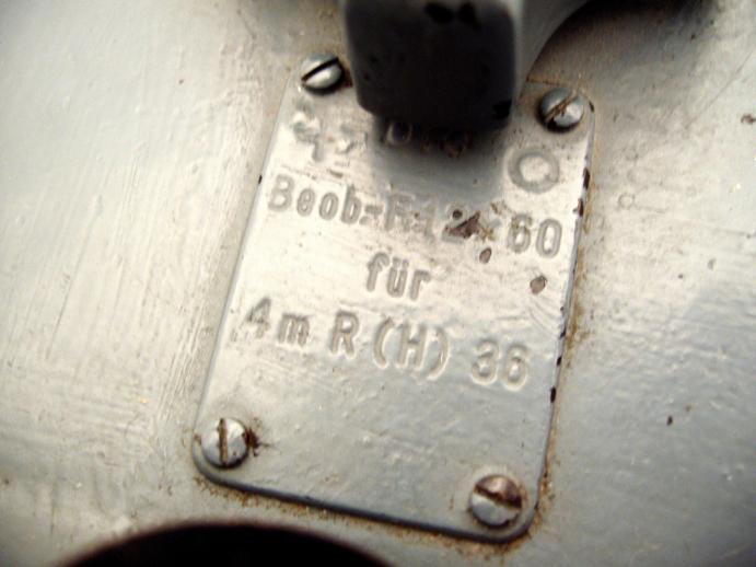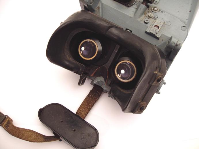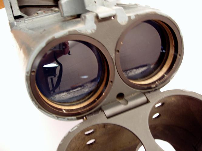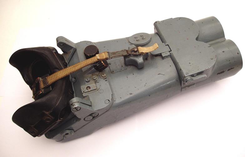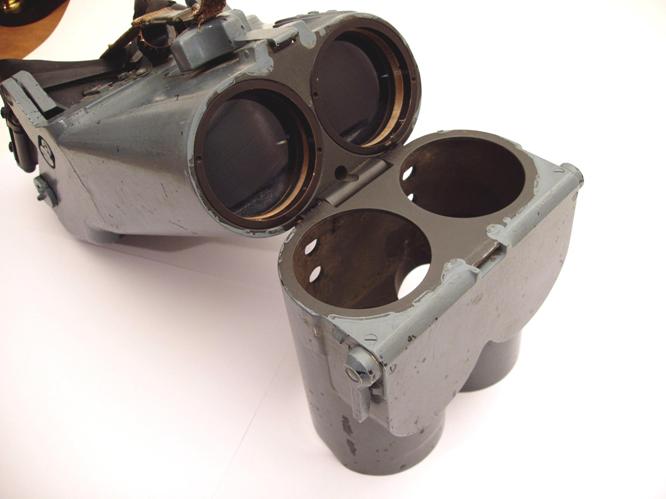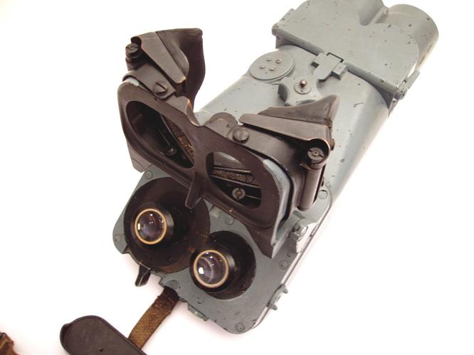Zeiss Richtungsweiser-Fernrohr, D. F. 12 X 60, ca. 1942 - 1944, Länge 41 cm, Breite 16 cm; Richt- und Beobachtungsfernrohr für 4 m-Raumbildentfernungsmesser mit 60 Grad Schrägeinblick; mit 2 integrierten einschaltbaren Filtern; in dem abklappbaren Regenschutzrohr befinden sich per Hebel vorklappbare Lochblenden zur Verringerung des wirksamen Objektivdurchmessers; die gummi-armierte Kopfstütze ist nach oben wegklappbar; auf dem linken Okulartubus findet sich eine mit 4 Schrauben befestigte runde Platte, deren Funktion sich nicht klären lässt; Verstellung der Augenweite über einen Hebel unterhalb des linken Okulars, Einzelokularjustierung; Trockengeräteanschlüsse seitlich am Körper des Instruments; mit Okularschutzkappe( von einem Band gehalten), Signatur auf einem Schild oben auf den Fernrohr "blc Beob. F 12 X 60 für 4 m R (H) 86"; und auf der Unterseite die Nr. "243.418"; gleiches Gerät wie in Seeger, H.: Militärische Ferngläser und Fernrohre, S. 226 (Abb. 140 oben links und oben Mitte); offenbar originaler blau-grauer Farbanstrich mit Resten eines vorne umlaufenden roten Farbstreifens, mechanisch und optisch gut bis sehr gut, guter äußerer Zustand mit mittleren Gebrauchsspuren, ein seltenes Stück. A rare Zeiss D. F. 12 X 60 binocular director telescope for a 4 m rangefinder, blue grey finish with rest of a red ring painted arround the front; adjustment and interocular distance; connectors for the desiccating apparatus are both sides of the body; with swing-down sunshade; colour glass filters to switch; adjustment mechanism for the position of the rubber face shield; bakelite rain cover for oculars; all parts are original, original finish; the glass is in very good original condition! Signature like above with the blc trademark of Carl Zeiss.