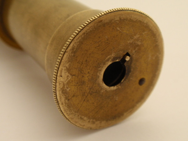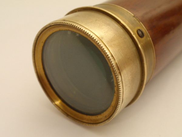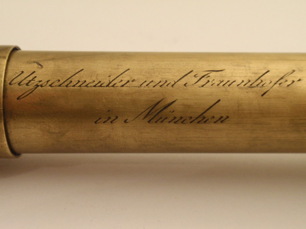 Messing mit schönem Holzgriff, nicht bewegliche Teile original zaponiert, ca. 1820; Länge 54 cm, Durchmesser der vorderen Linse 3,5 cm; 3fach-Auszug, Signatur in Schreibschrift "Utzschneider u. Fraunhofer in München"; optisch sehr gut, perfekte Funktion, Erhaltung gut bis sehr gut. verkauft / sold