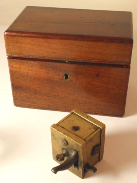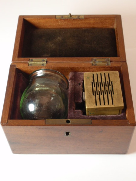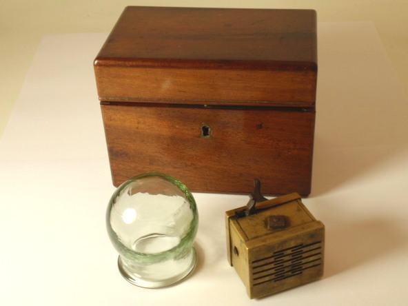 ca. 1870 - 1890, Maße des Kastens 12,5 x 7,5 x 9 cm; 1 Schröpfkopf (mundgeblasen, grünliches Glas, Höhe 5,5 cm) und ein Schröpfschnepper aus Messing; die Messer lassen sich bewegen, bleiben aber leider nicht arretiert; alles in einem mit violettem Samt ausgelegten Mahagonikasten. Bis auf die Nichtfunktion des Schröpfschneppers alles in einem guten bis sehr guten Zustand.