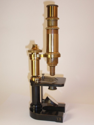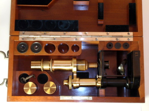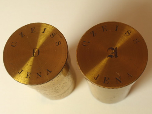 voll Messing, original zaponiert mit original geschwärztem Fuß, ca. 1898, Höhe 28 cm; 2 signierte Objektive (A und D) in ebenfalls signierten Messingdosen, 2 signierte Okulare (1 und 2), Grobeinstellung per Tubus, Feineinstellung, Lochblendenhülse mit Lochblende unter dem Tisch, Signatur auf dem Fuß "Carl Zeiss Jena 31.809"; mechanisch und optisch sehr gut, Erhaltung gut bis sehr gut; schöner Kasten.